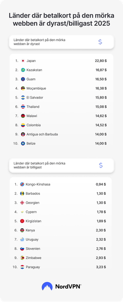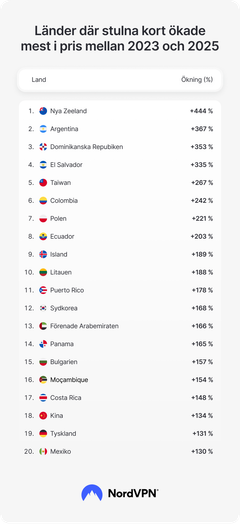 NordVPN, 30 oktober, 2025 – Uppgifter från stulna betalkort cirkulerar på dark web-marknadsplatser varje dag. Det är inte ovanligt att annonserna även innehåller korthållarens namn, adress, e-post och andra uppgifter som gör det enklare för en bedragare att kringgå säkerhetskontroller. Ett svenskt betalkort kostar ungefär 8,74 euro – dyrare än det globala genomsnittspriset på ungefär 7 euro. I Norden är det endast Danmark som placerar sig högre med ett pris på ungefär 9,31 euro, medan ett norskt betalkort går att köpa för 7,74 euro och ett finskt för 6,73 euro.