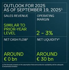 Inom fordonsdivisionen förväntar sig företaget en investeringskvot på mellan 12 och 13 procent år 2025. Nettokassaflödet för år 2025 förväntas uppgå till cirka 0 miljarder euro. Detta inkluderar kassautflöden för framtidsinriktade investeringar samt för omstruktureringsåtgärder. Nettolikviditeten i fordonsdivisionen förväntas uppgå till cirka 30 miljarder euro år 2025. Volkswagen-koncernen fortsätter att sträva efter sitt mål att upprätthålla en solid finansierings- och likviditetspolicy.