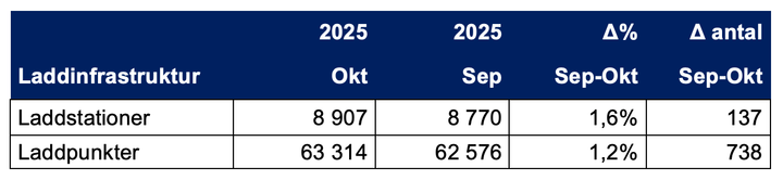 Utbyggnaden av den publika laddinfrastrukturen i Sverige fortsätter. Under oktober tillkom 738 nya laddpunkter, vilket innebär att det nu finns totalt 63 314 laddpunkter fördelade på 8 907 laddstationer.