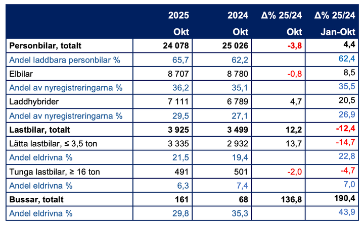 Under oktober registrerades 3 335 nya lätta lastbilar, en ökning med 14 procent. Efter en lång period med utmanande marknadsförutsättningar, där många kunder skjutit upp sina fordonsbyten, har behovet av nya fordon och bättre driftsekonomi nu ökat. Hittills i år har lätta lastbilar dock minskat med 15 procent, efter åtta inledande månader med vikande nyregistreringar. Andelen nya lätta lastbilar med ren eldrift uppgick till 21,5 procent i oktober och till 23 procent hittills i år. Laddhybriderna har haft en mycket stark utveckling under året och svarade i oktober för 7 procent av de nya fordonen. Under januari-oktober är andelen nära 5 procent, jämfört med 0,2 procent samma period 2024.