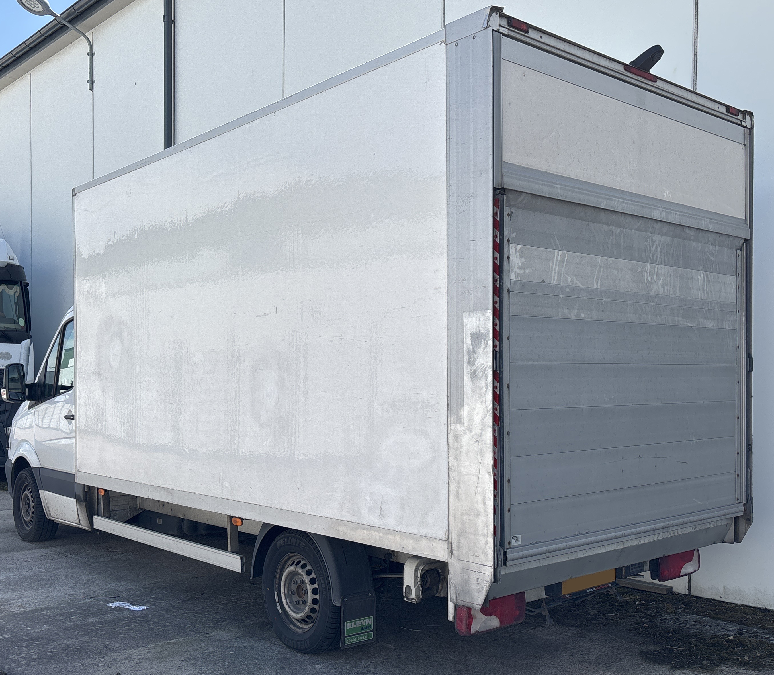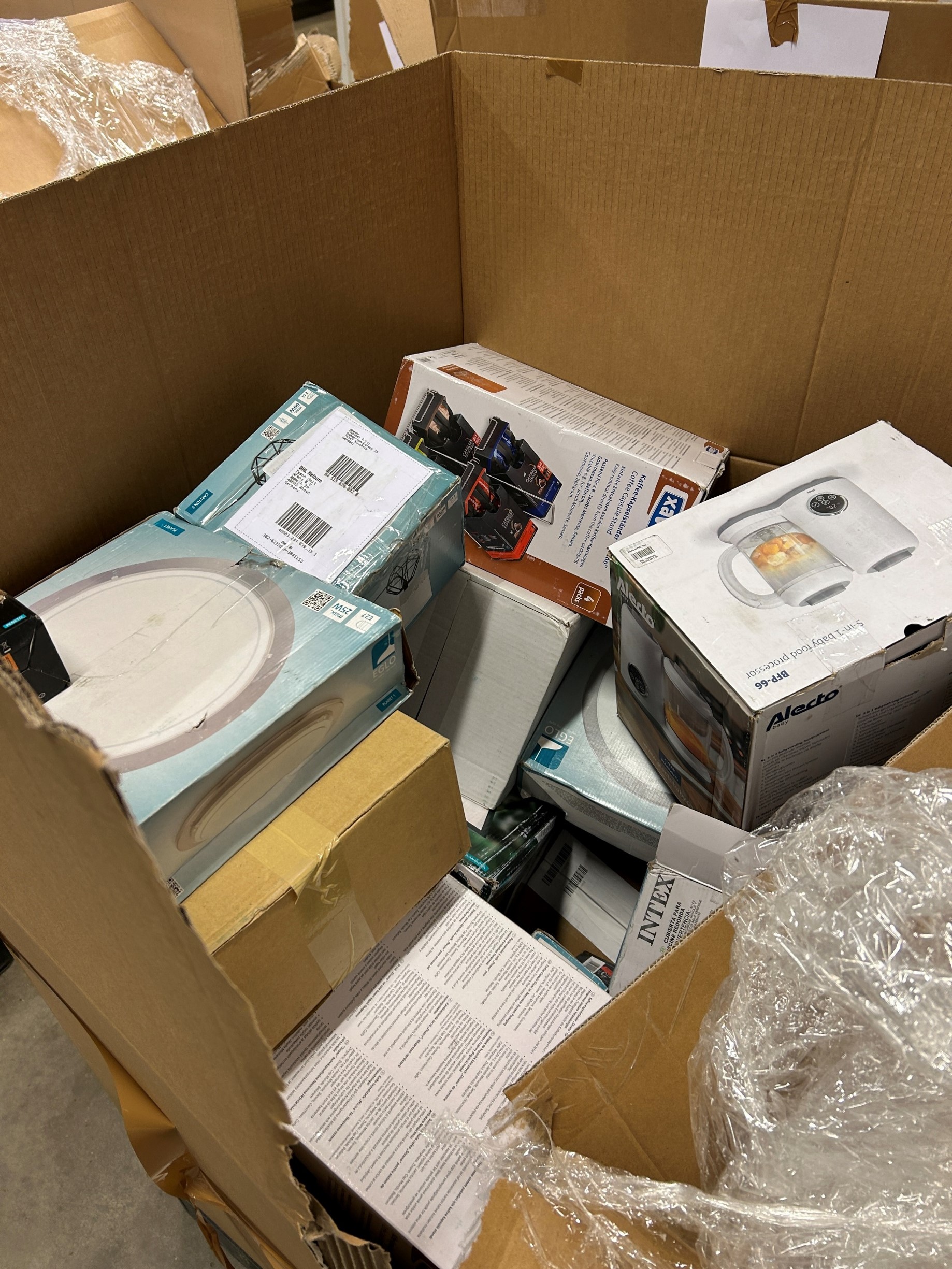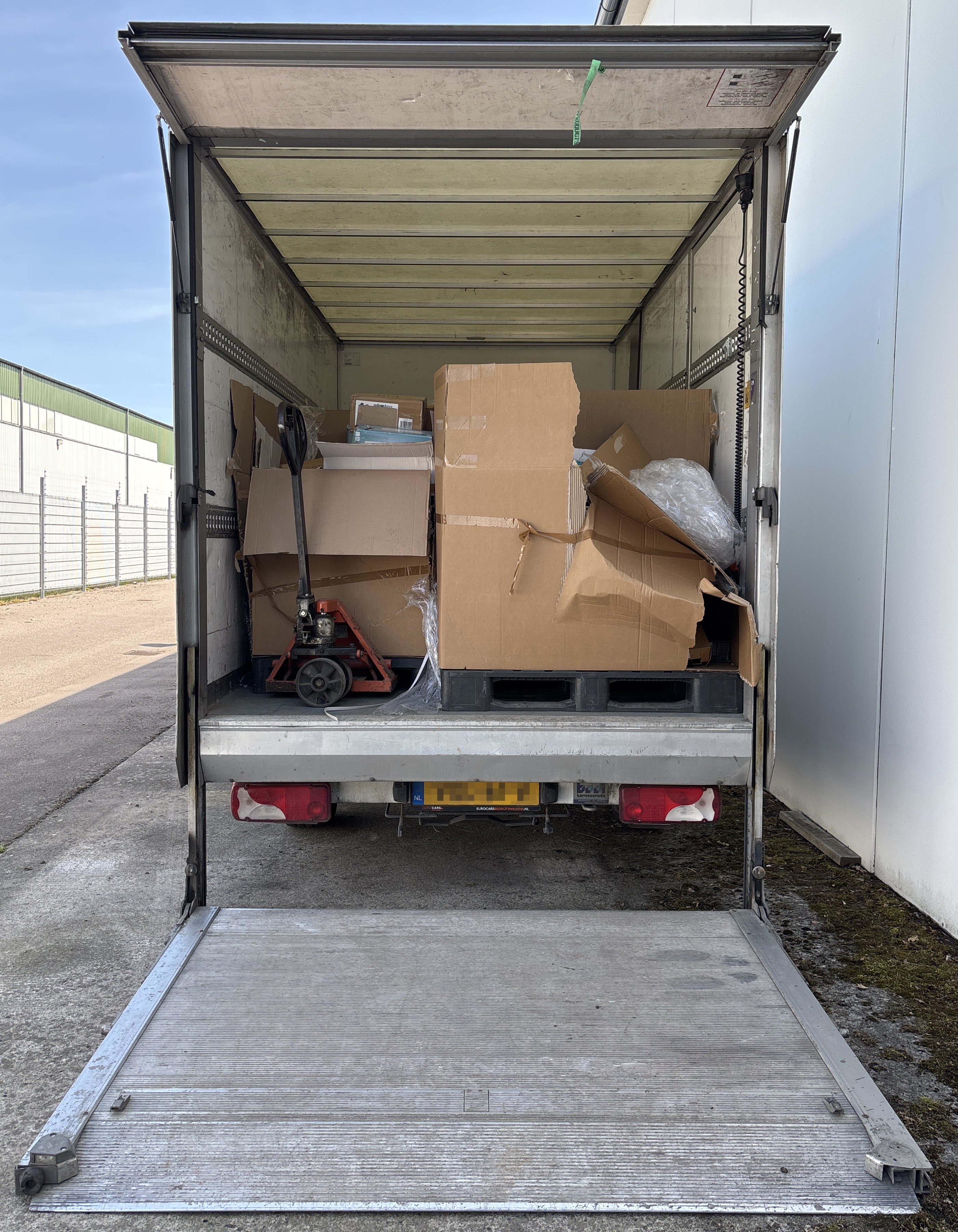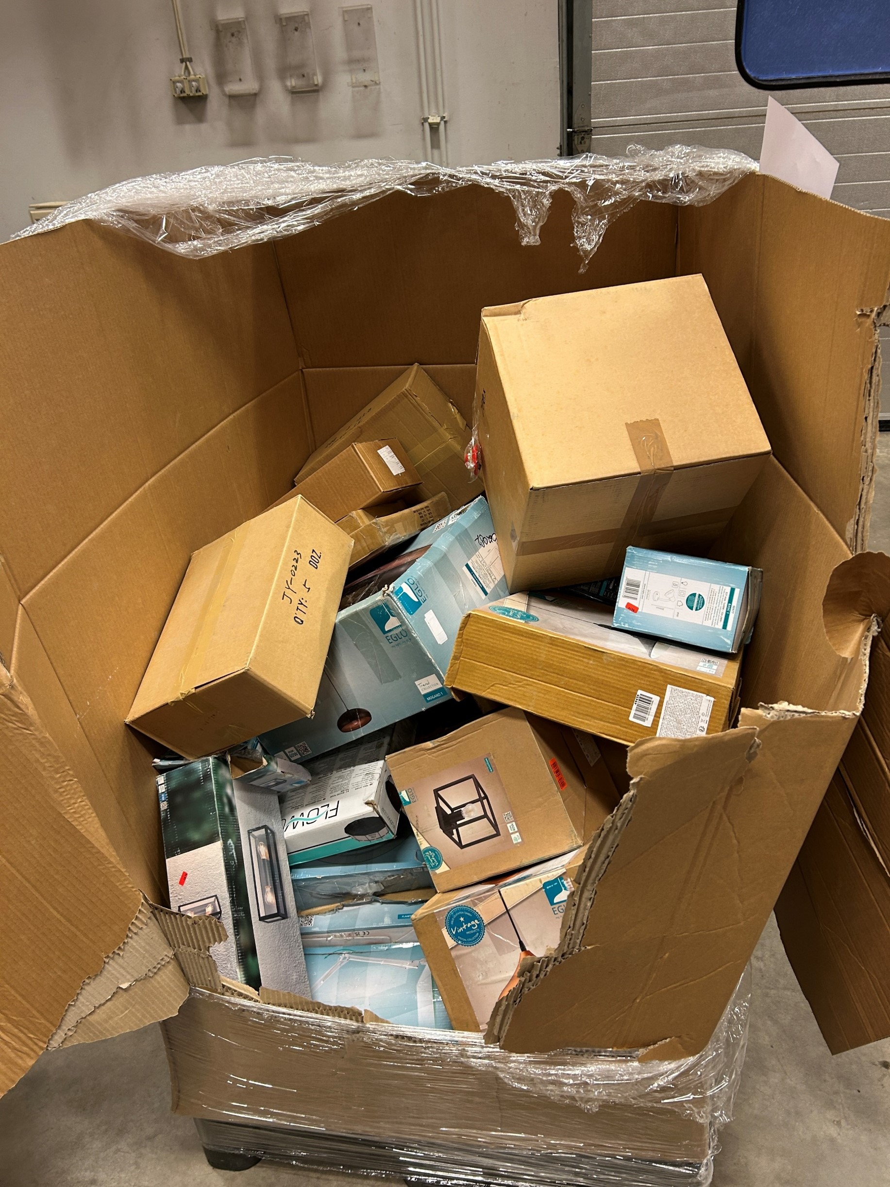– När vi väl kommer in i lastutrymmet står där åtta stycken stora höga bruna kartonger på varsin träpall. Samtliga pallar och kartonger är inplastade och märkta med etiketter med streckkod som det även står DHL på. Kartongerna innehåller trasiga och gamla varor som ligger i en enda röra. Vi blir därför tvungna att köra in fordonet i vår hall för att kunna kontrollera all last, säger Sammy Landén.