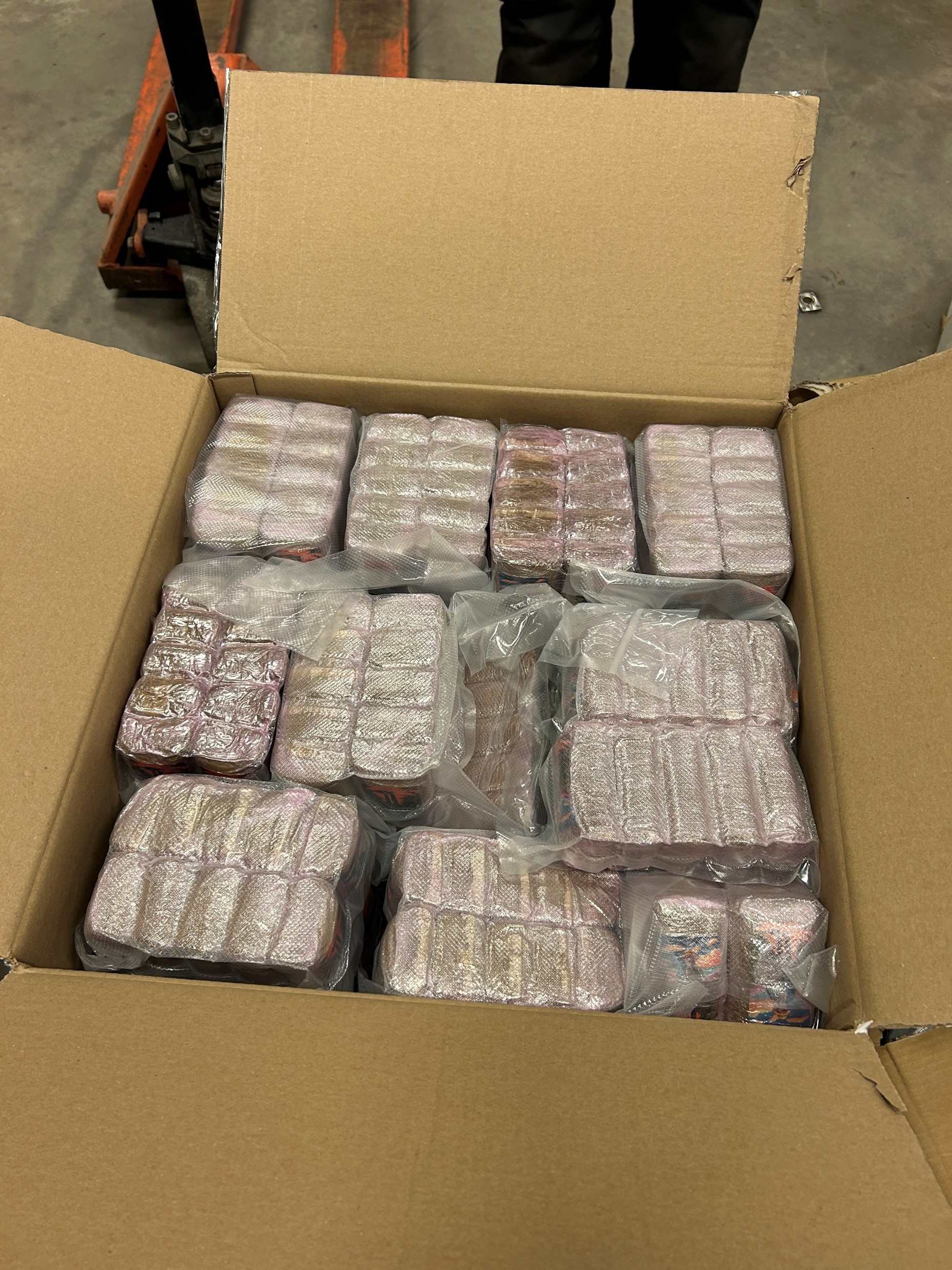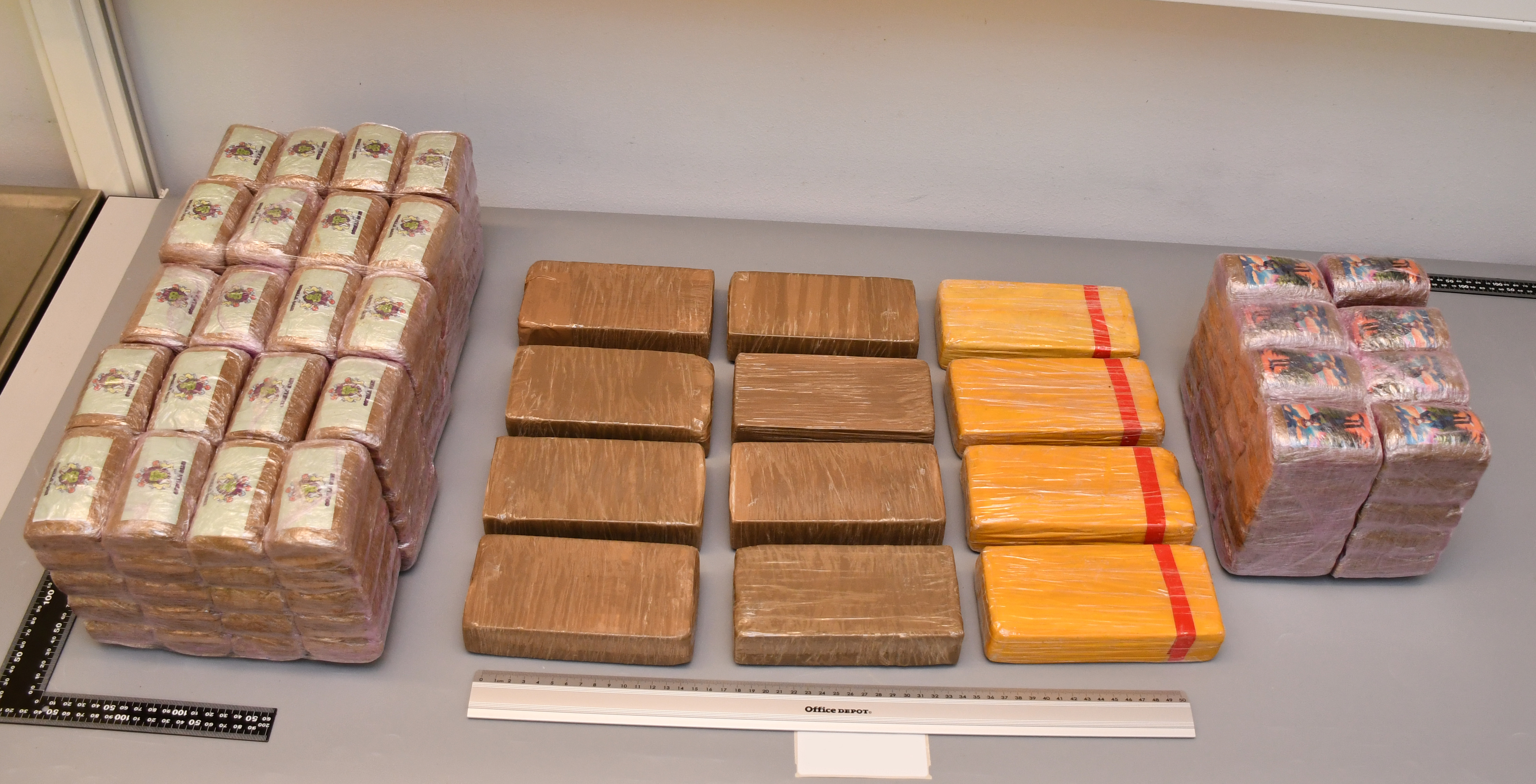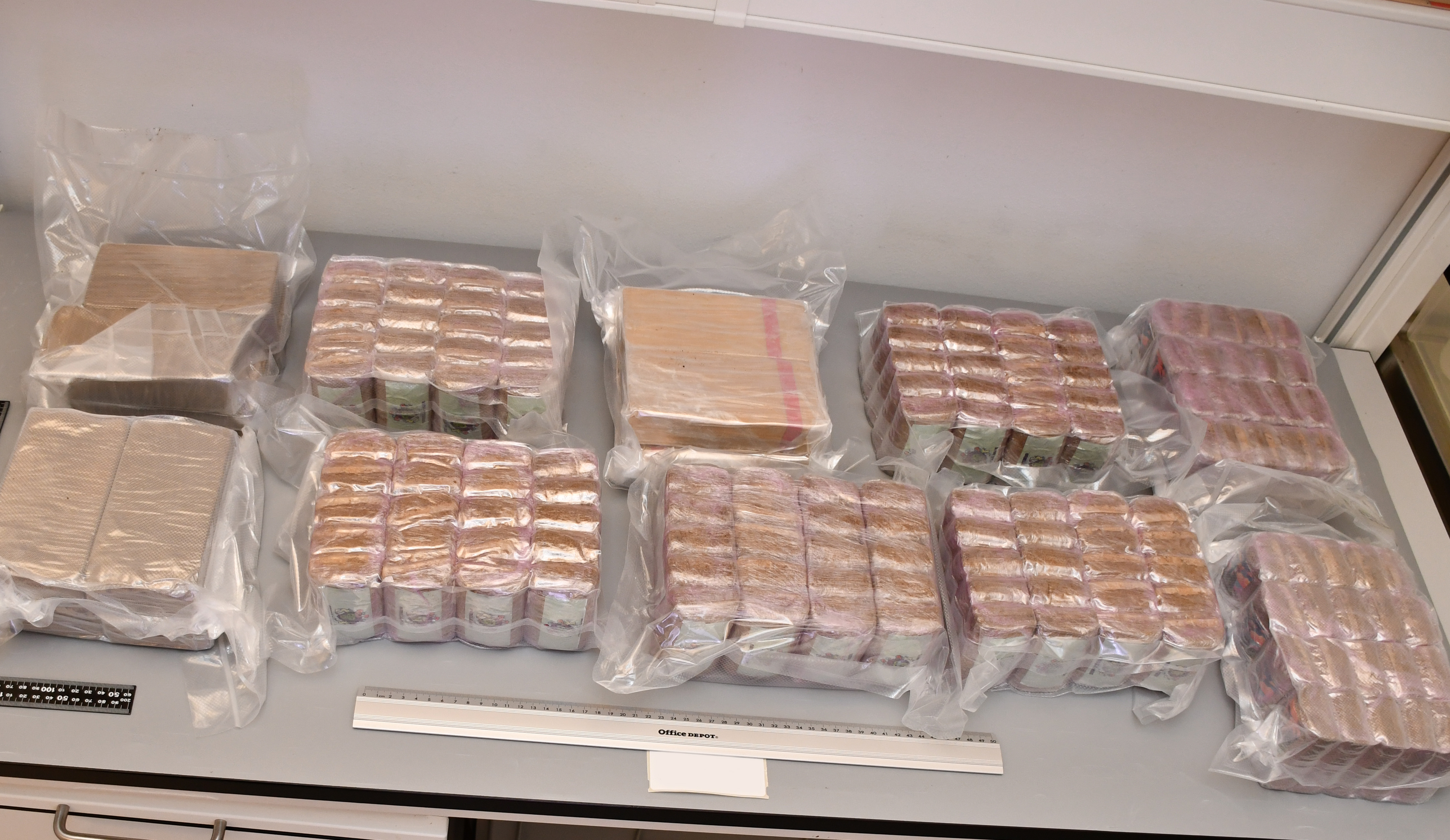 Alla pallar med bruna kartonger tas ut men de två innersta kartongerna känns tyngre än övriga kartonger. När dessa öppnas är det en fullträff. I fem mindre kartonger hittas sammanlagt cirka 237 kilo cannabisharts och nästan 5,9 kilo heroin.