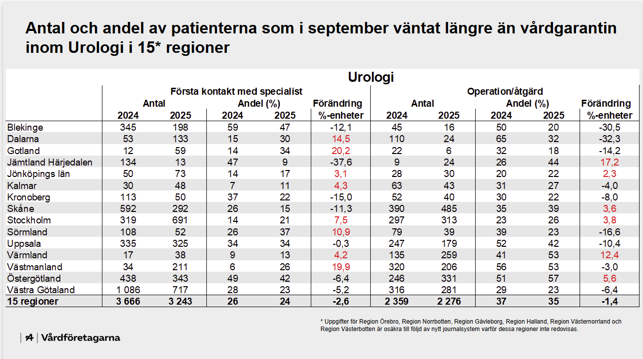 I de 15 regionerna hade 35 procent, motsvarande 5 519 patienter, fått vänta längre än vårdgarantin inom urologi, antingen på att få ett första besök hos en specialist eller på att få sin operation eller behandling. Det är en något lägre andel än för ett år sedan, då motsvarande siffra var 37 procent.