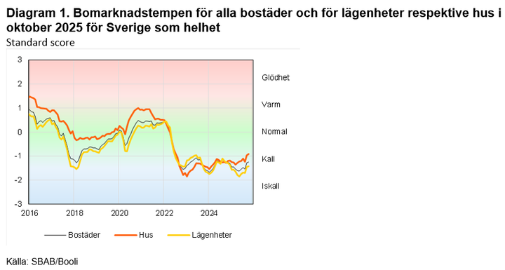 SBAB/Booli:s indikator Bomarknadstempen – som mäter hur lätt det är att sälja en bostad – visar att temperaturen på den svenska bostadsmarknaden som helhet fortsatte att stiga i oktober. För lägenheter sjönk både andelen prissänkta objekt och utbudet samtidigt som budpremierna och antalet budgivare steg – allt i förhållandet till sina historiska genomsnitt. Samma utveckling syntes för villor, med undantag för antalet budgivare som sjönk. I Stockholms innerstad är det normal temperatur och i Göteborgs dito nära normal temperatur. Innerstaden i Malmö är på tydlig uppgång. De mindre lägenheterna – ettor och tvåor – har nu nästan hämtat igen tappet till de större.