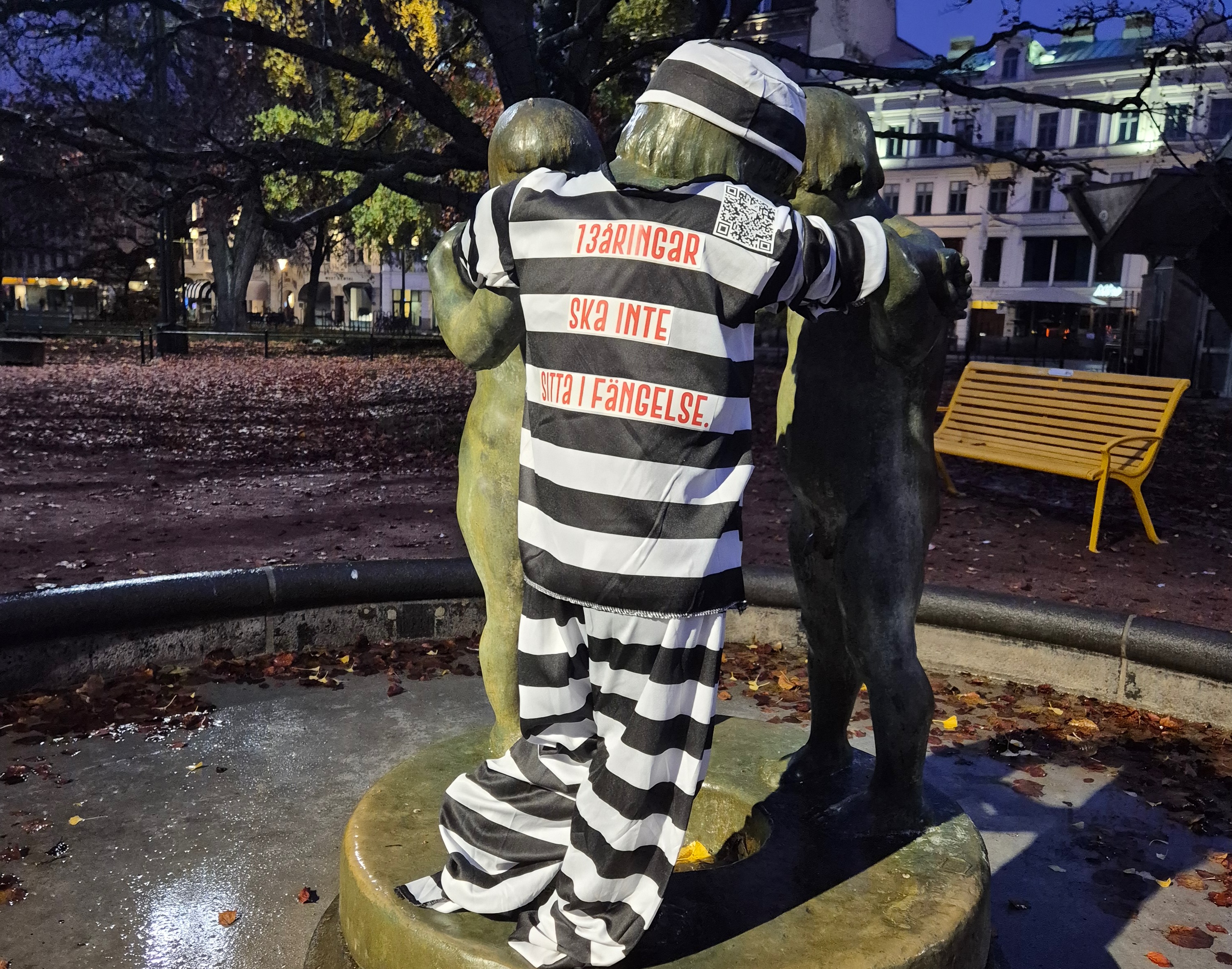 ”13åringar ska inte sitta i fängelse”. Det är budskapet som står på den fångdräkt som statyn Lekande barn klätts i. Statyn är en av flera barnstatyerna i olika svenska städer som under onsdagen fått nya kläder. Det är barnrättsorganisationen Bris som ligger bakom initiativet och syftet är att synliggöra den kritik som finns mot regeringens förslag att sänka straffbarhetsåldern till 13 år för vissa grövre brott.
