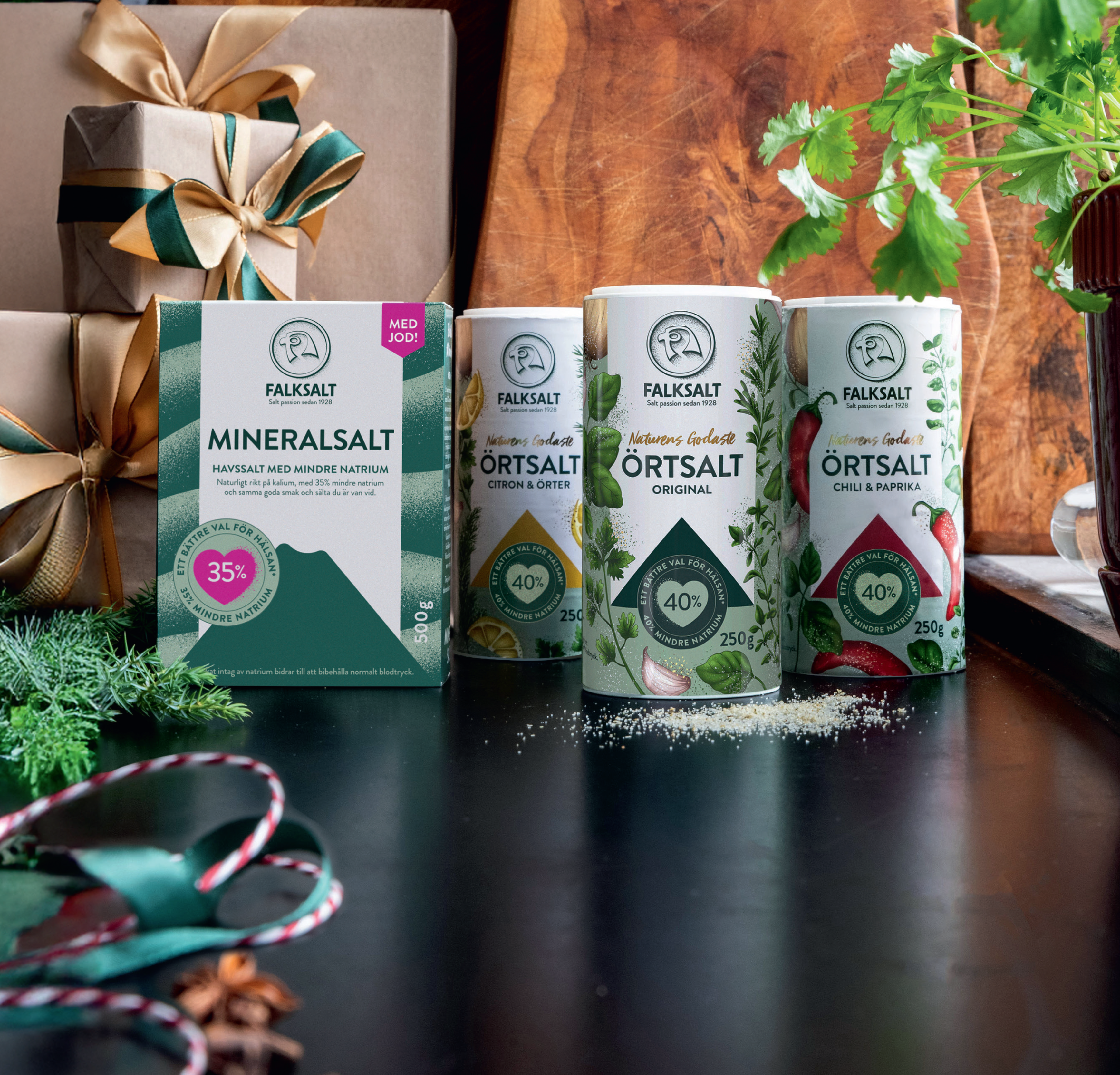 - I mineralsalt-sortimentet finns även Falksalt Örtsalt i tre smaker.