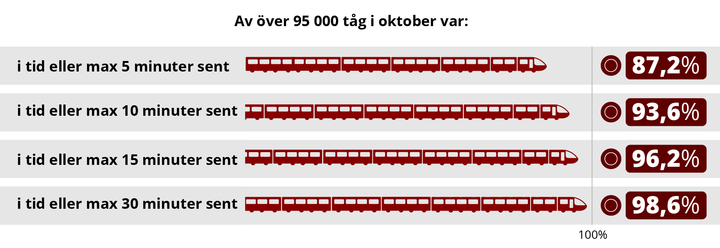 Under oktober 2025 reste resenärer med över 95 000 persontåg, vilket är rekord i antal framförda tåg någonsin. Sedan 2001 är det också den oktober då flest tåg ankommit sin slutstation i tid – över 83 000, vilket gav en punktlighet på drygt 87 procent, där de som var mer än fem minuter sena räknas som försenade. Över 96 procent av tågen kom fram inom en kvart.
