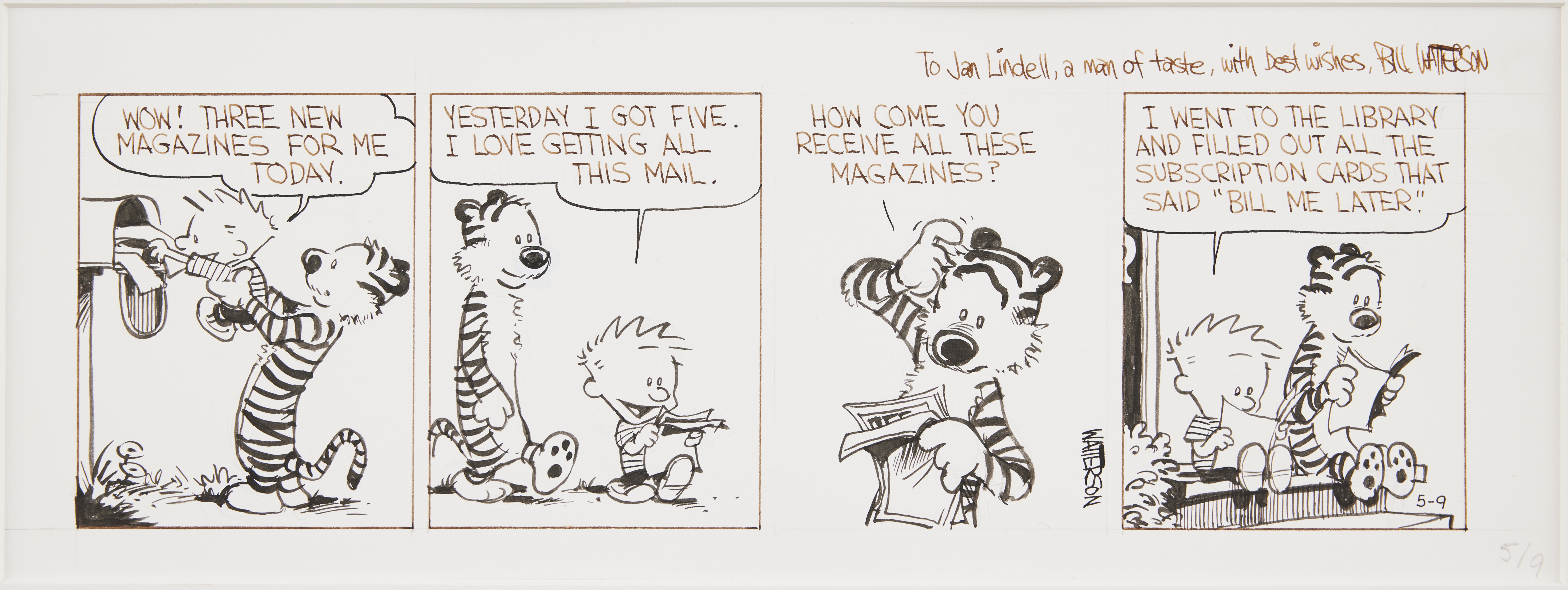 One of the auction’s most unexpected top results was the exceptionally rare original of a Calvin and Hobbes comic strip, gifted directly by Bill Watterson to Jan Lindell, former CEO of the comic book publisher Semic Press. Lindell published Calvin and Hobbes in Sweden and maintained close relationships with many cartoonists. The strong final price of SEK 1,812,500 confirmed the series’ status as the last great newspaper comic, as well as the significant international interest in original works that very rarely reach the market.