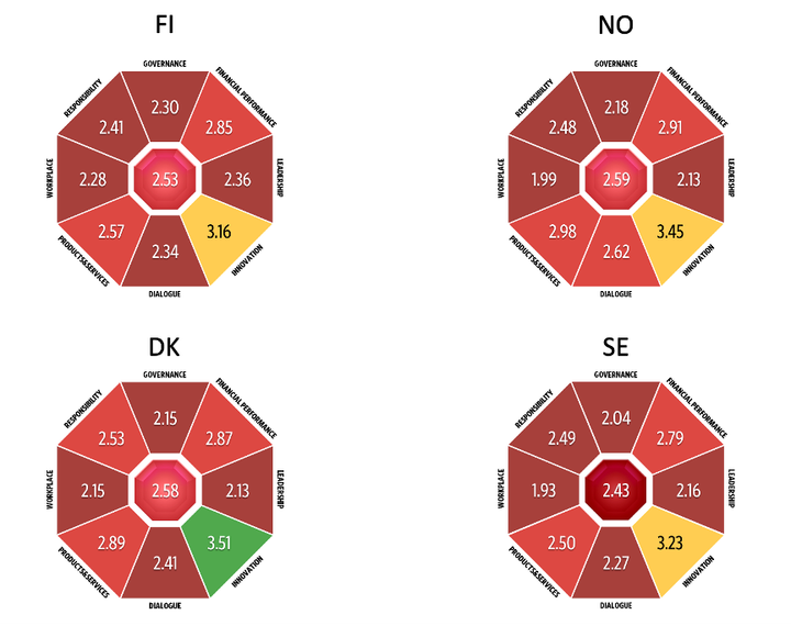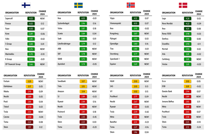 Studien Reputation&Trust 2025 genomfördes också i Finland, Norge och Danmark. De nordiska ländernas mest ansedda företag i år fanns i Danmark: leksaksproducenten Lego hade en anseendepoäng på 4,28.