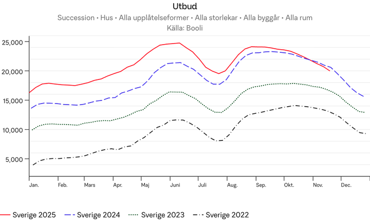 Nu börjar Booli se ett skifte på marknaden, där utbudet av villor har börjat vända nedåt. Under vecka 47 var utbudet av villor 3 procent lägre jämfört med motsvarande period förra året. Totalt var 19 982 villor till salu under vecka 47. Samma period förra året var siffran 20 591. Det är första gången på tre år som utbudet är lägre än året innan.