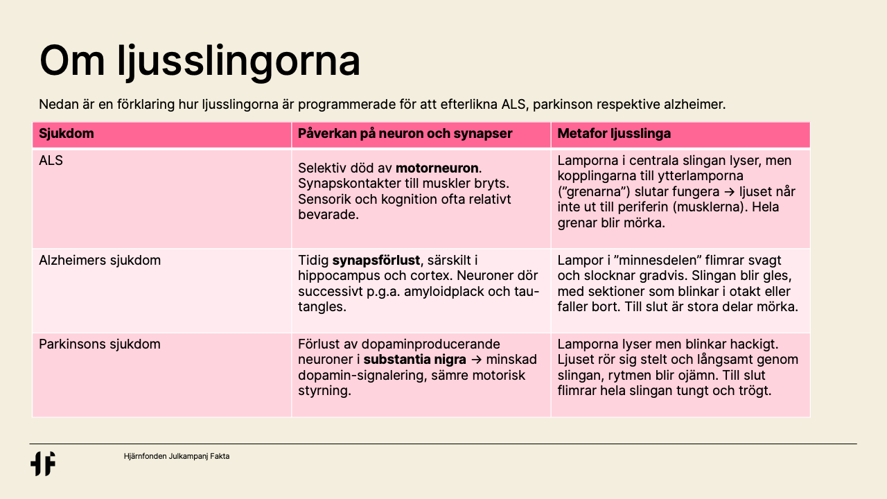 • ALS innebär att motorneuroner förlorar sin funktion. Ljusslingan tappar därför kontakten med de yttre lamporna som symboliserar musklerna.