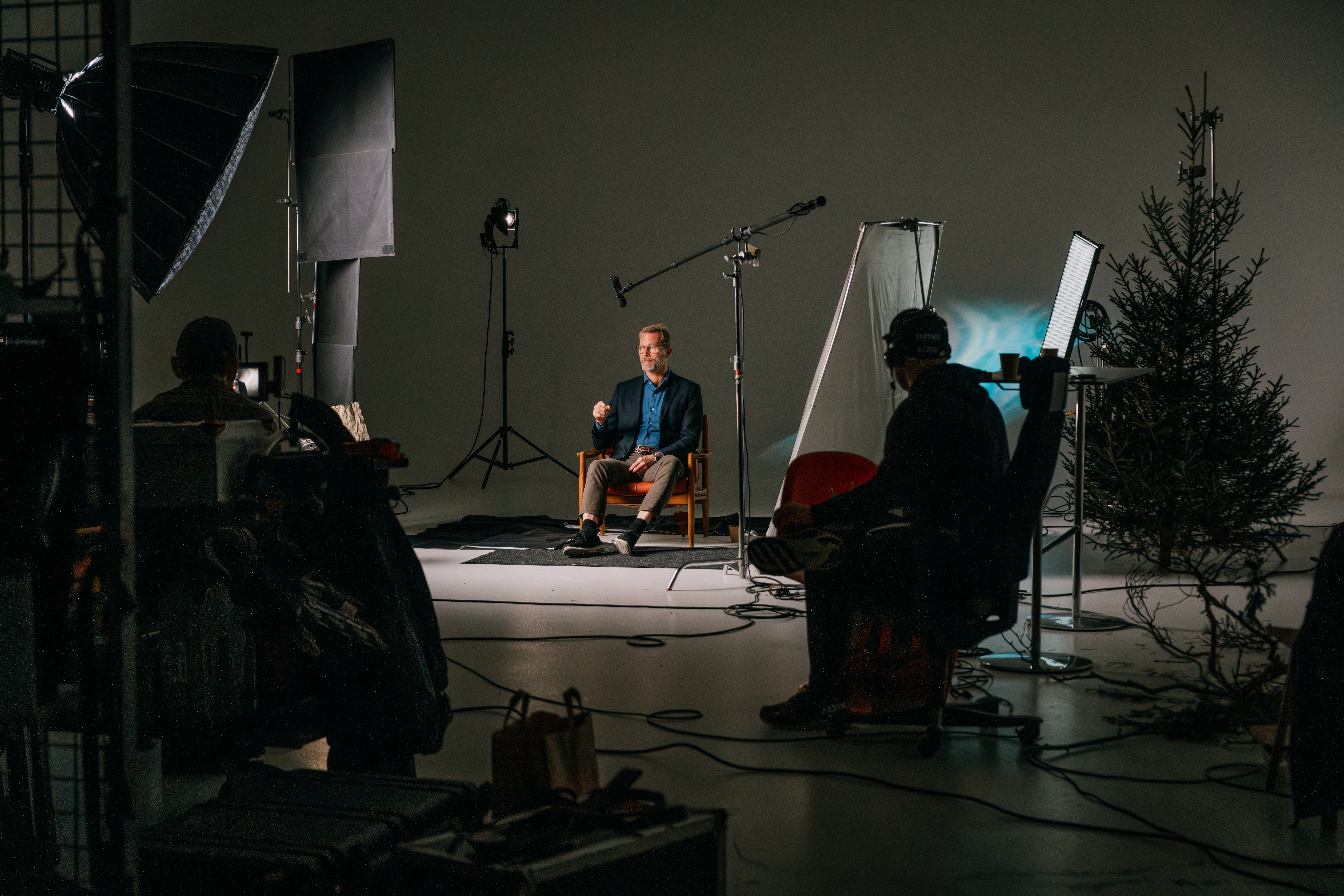 Person sitter i en inspelningsstudio omgiven av ljusutrustning och en kameraman medan inspelning pågår.