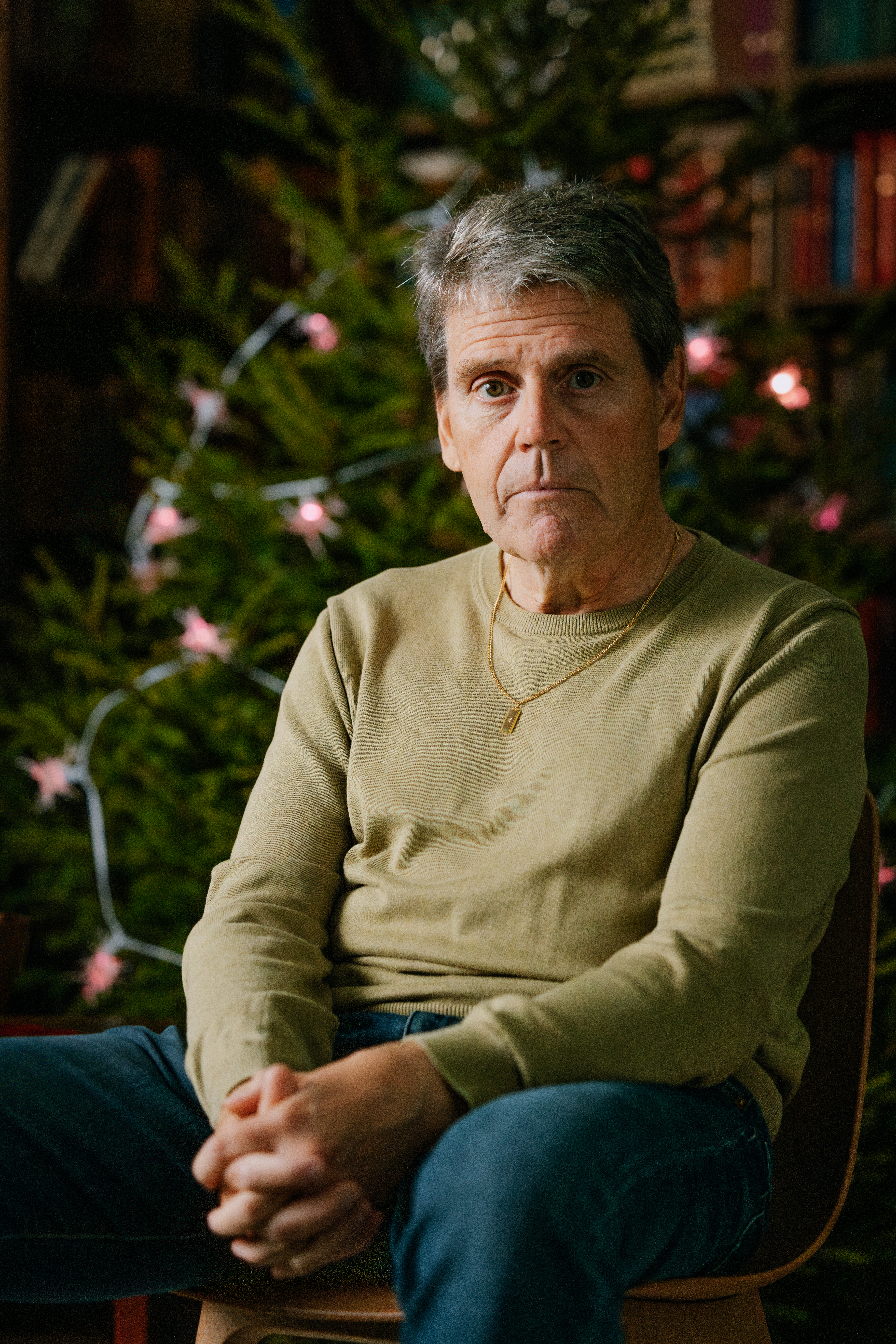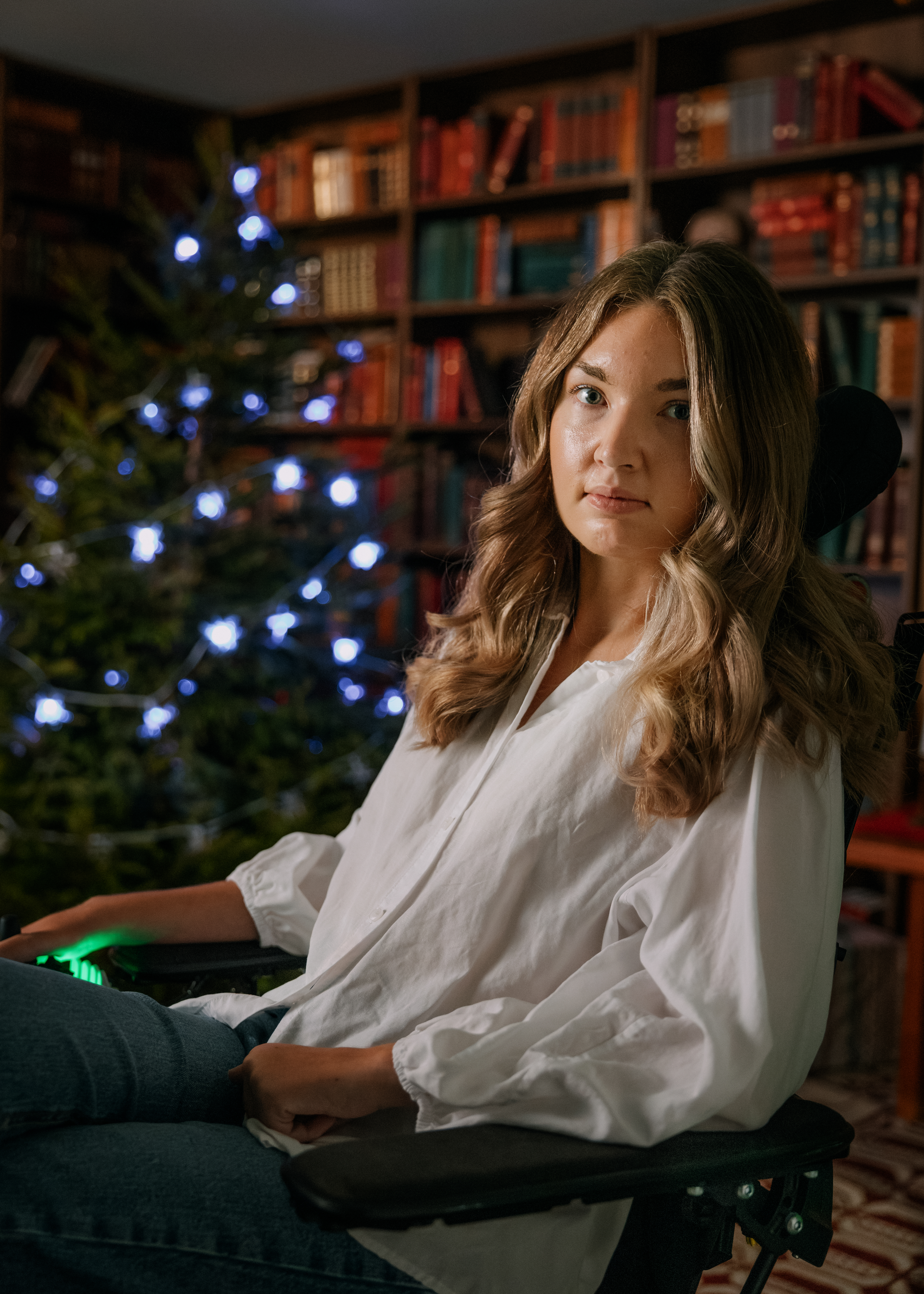 En person med långt hår sitter i en stol framför en bokhylla och en julgran med ljus.