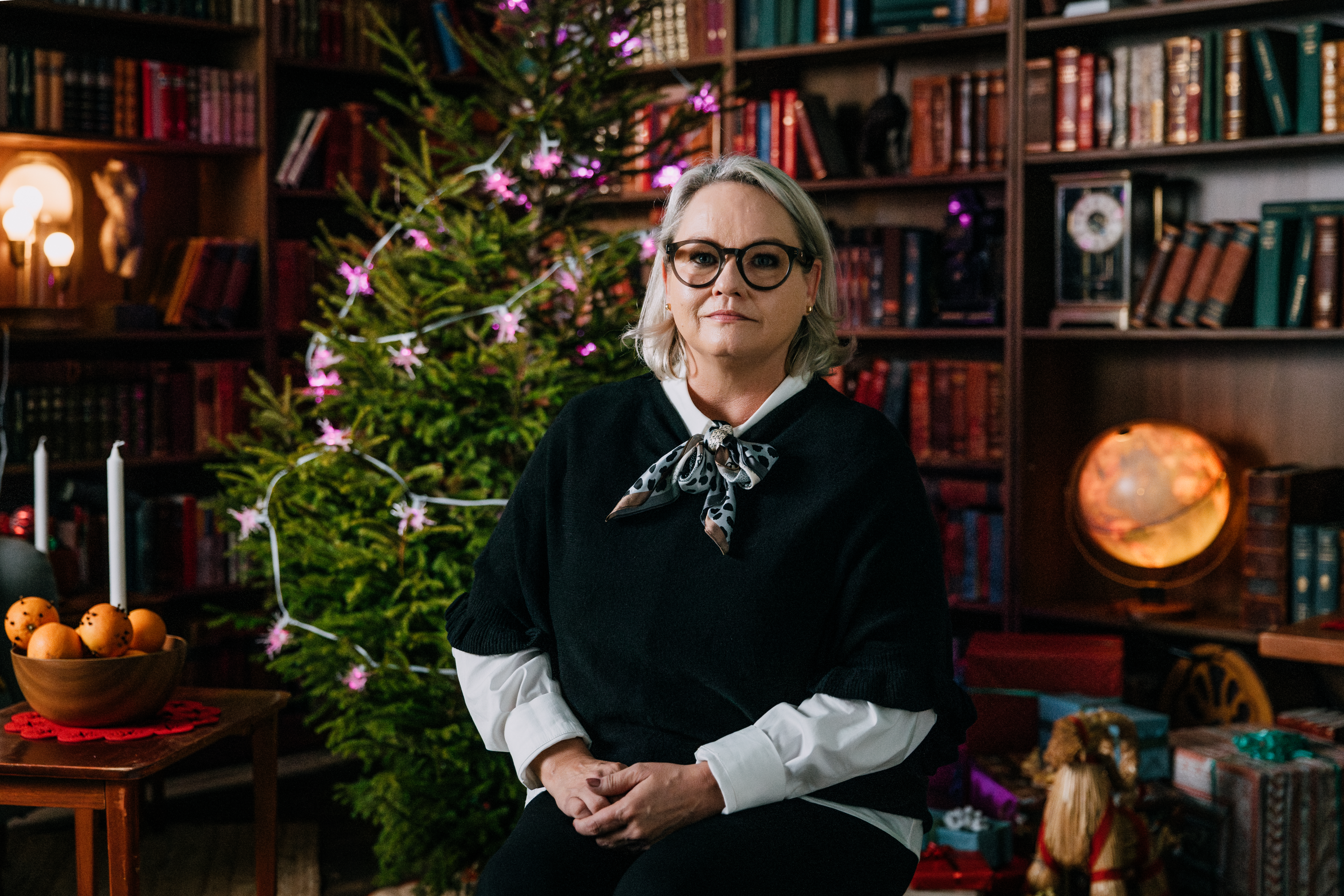 Kvinna sitter i ett rum med en julgran och bokhyllor i bakgrunden.