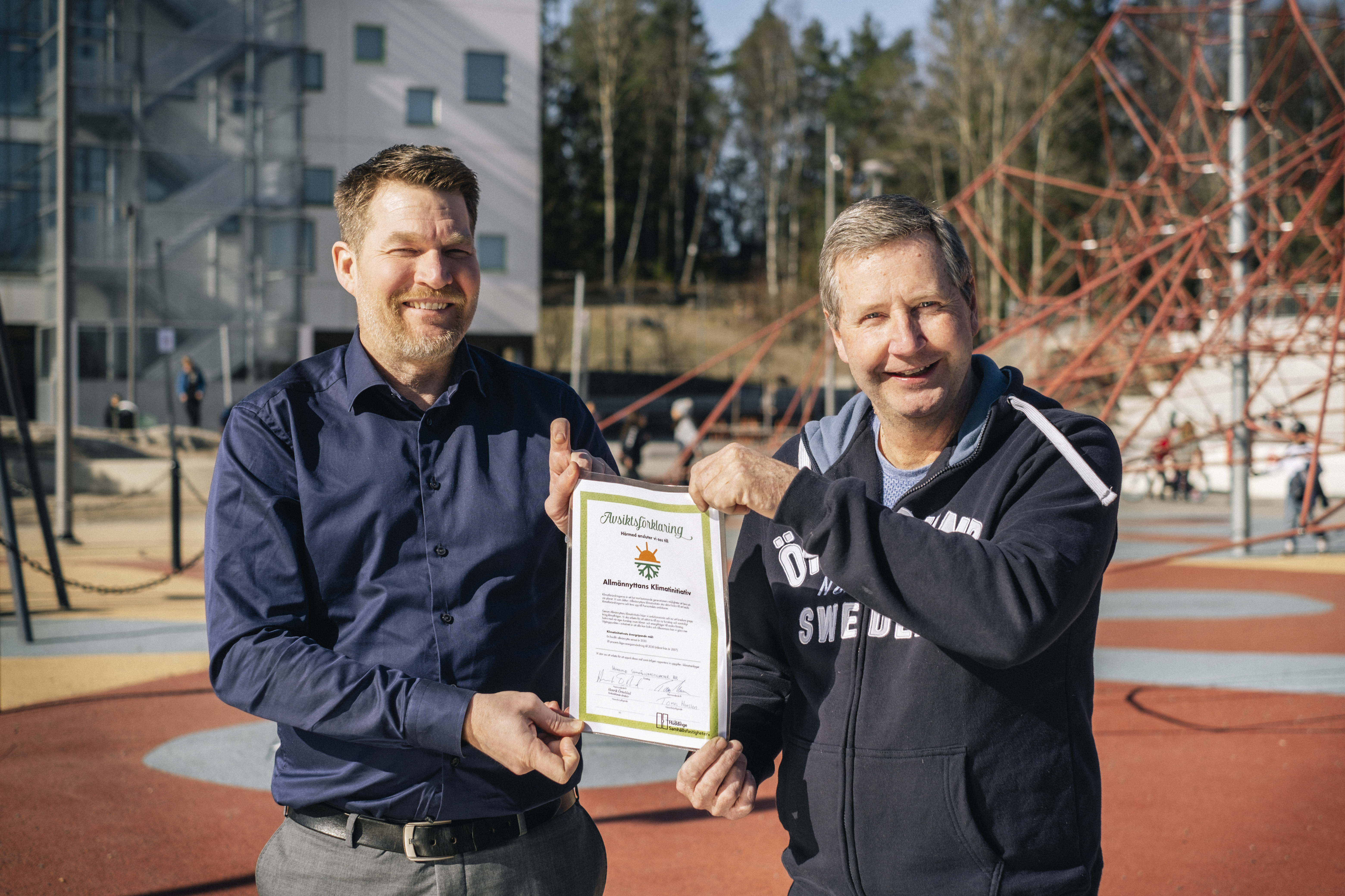 Huddinge Samhällsfastigheters vd Henrik Örneblad och styrelseordförande Tomas Hansson undertecknade Allmännyttans klimatinitiativ på Glömstaskolans skolgård i södra Huddinge.