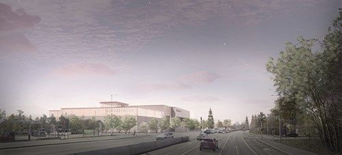 Visionsbild som visar hur den nya sim- och idrottshallen kan komma att se ut. Vy från Huddingevägen. Bild: Sweco Architects.