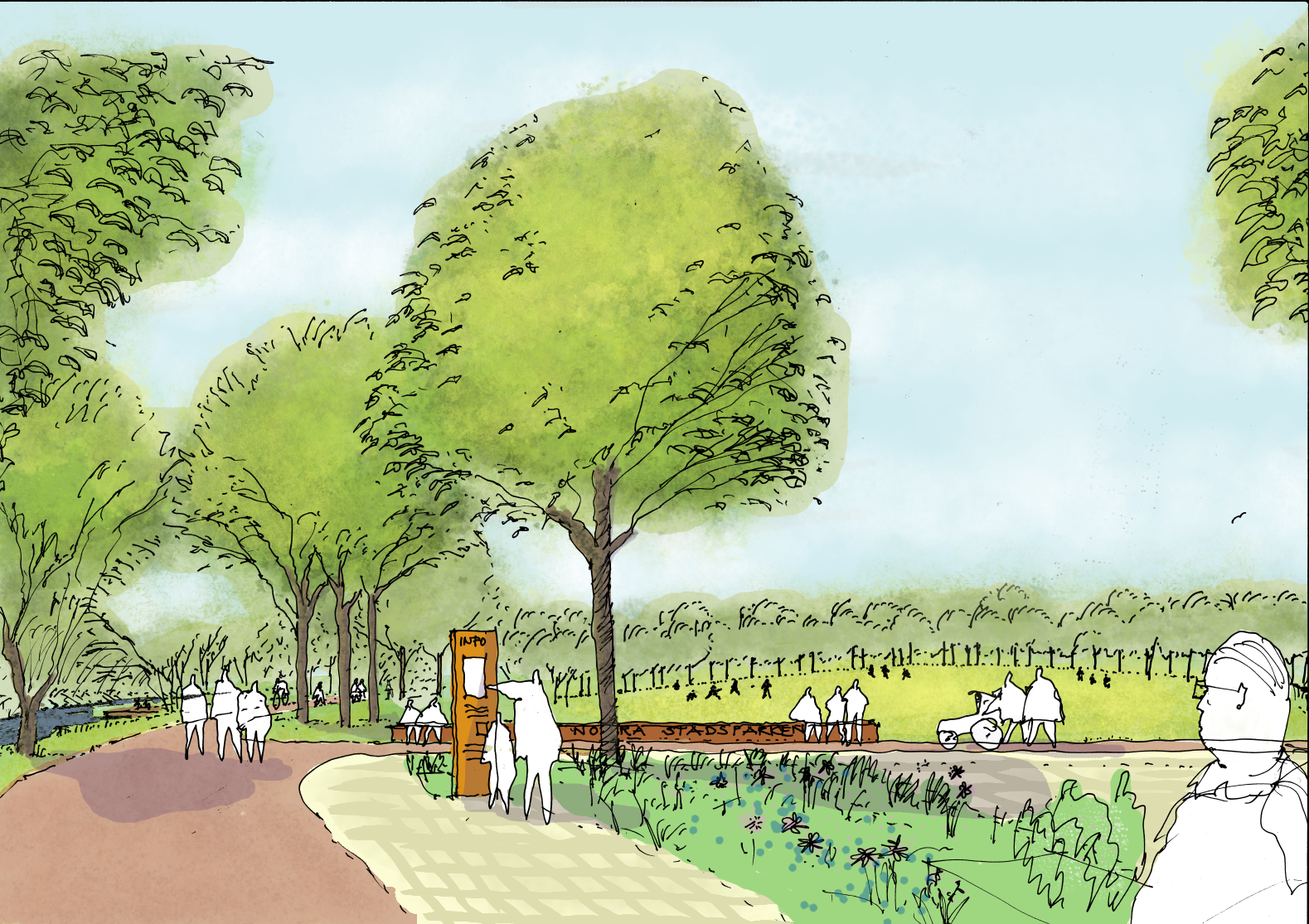 Norra stadsparken ska göra Å-stråket mer öppet och attraktivt, med ett sammanhängande parkrum som bjuder in till aktiviteter, evenemang och rekreation i olika delar av parken. Ett nytt gång- och cykelstråk längs ån gör det enkelt att ta sig fram och njuta av miljön.