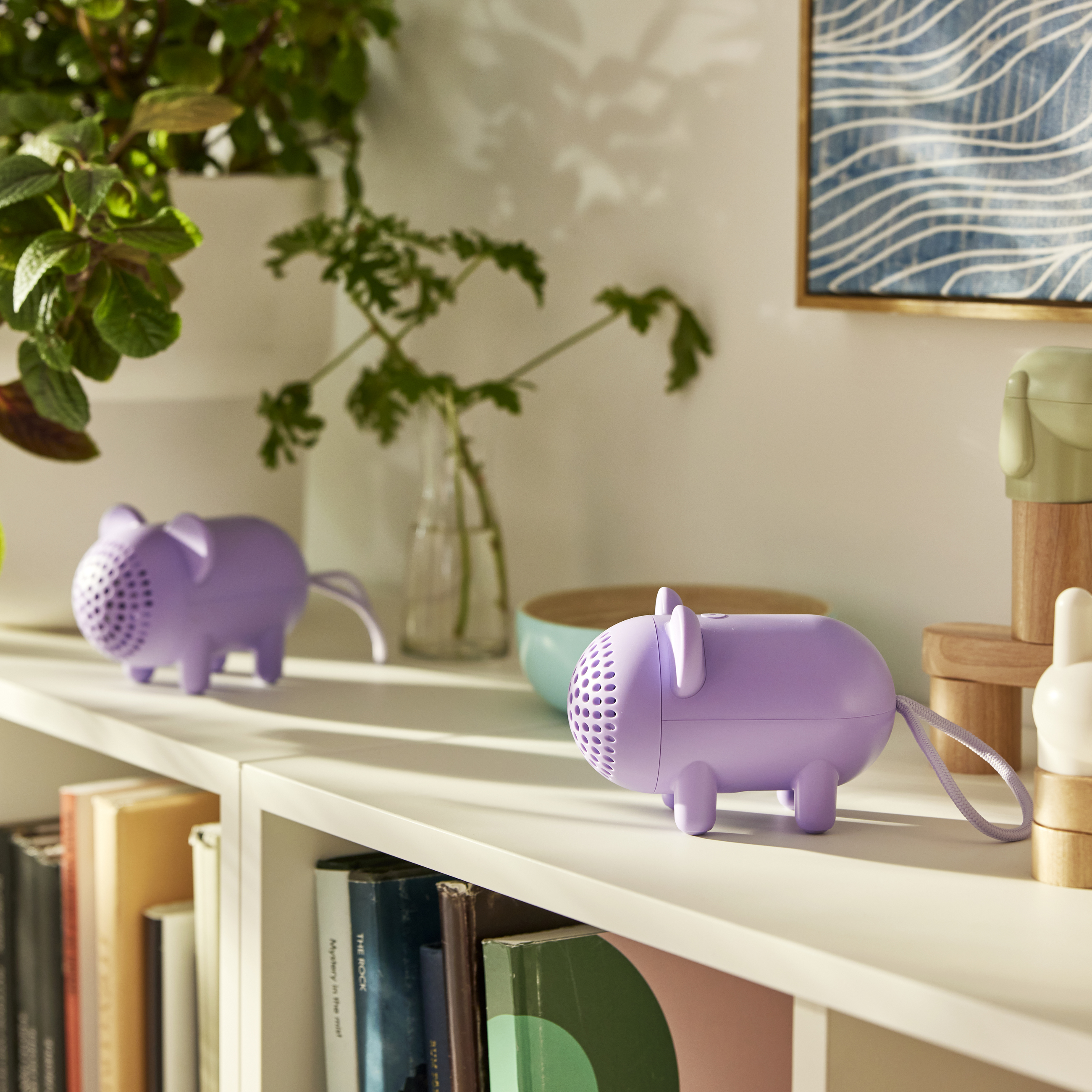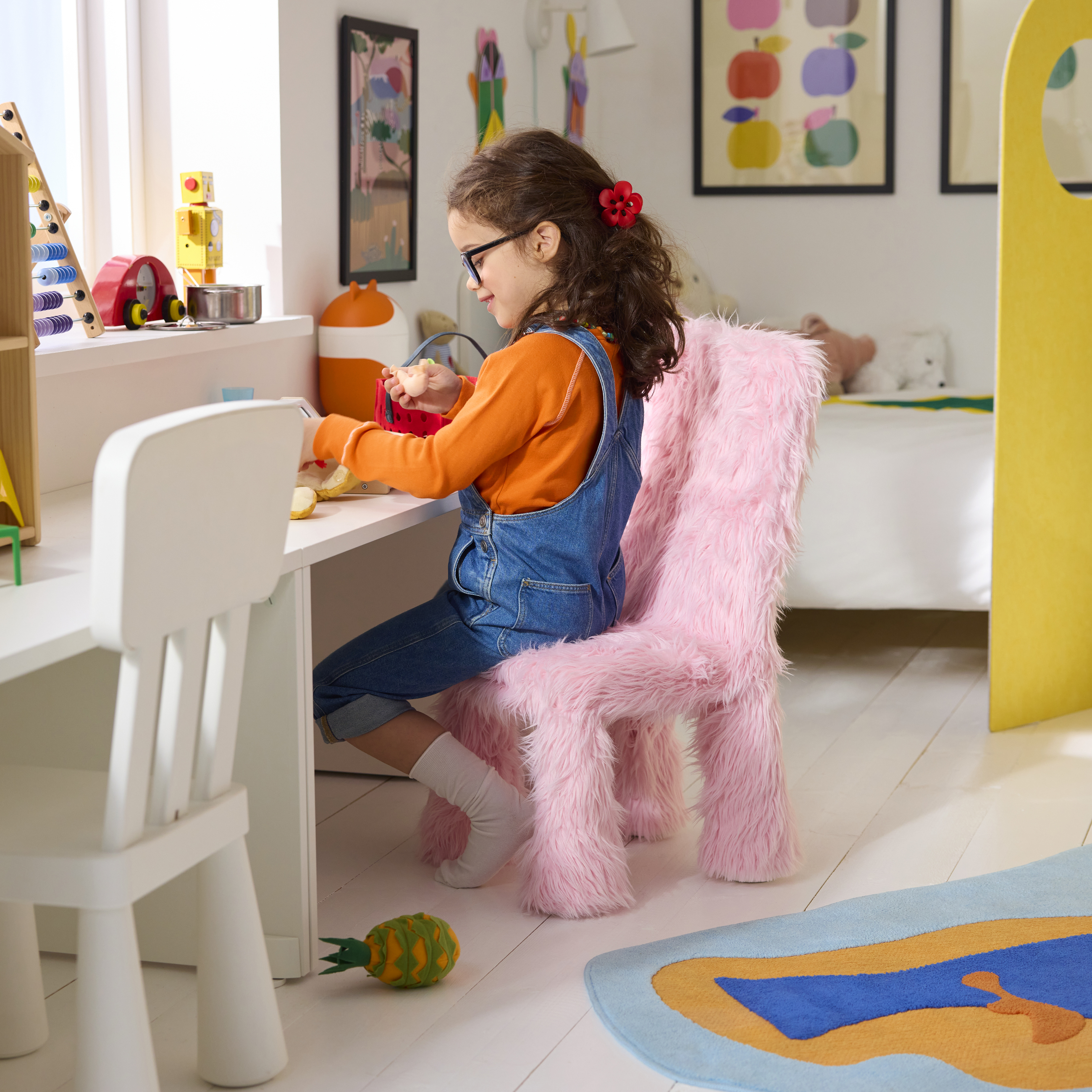MAMMUT barnstol, en klassisk barnmöbel från IKEA som designades för 30 år sedan, får ett nytt utseende med ett pälsöverdrag i knallrosa eller blått. Förvaringsmöbler i form av katter och högtalare i form av möss i lila eller grönt är funktionella designföremål. En klassisk förvaringspuff avslöjar sitt inre monster först när den öppnas och tar en tugga av innehållet med en leende tandrad, medan en gunghäst i form av en fågel både är skulptur och leksak
