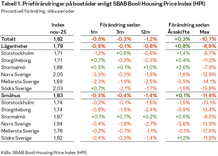 Bostadspriserna sjönk med 0,5 procent i november i Sverige som helhet