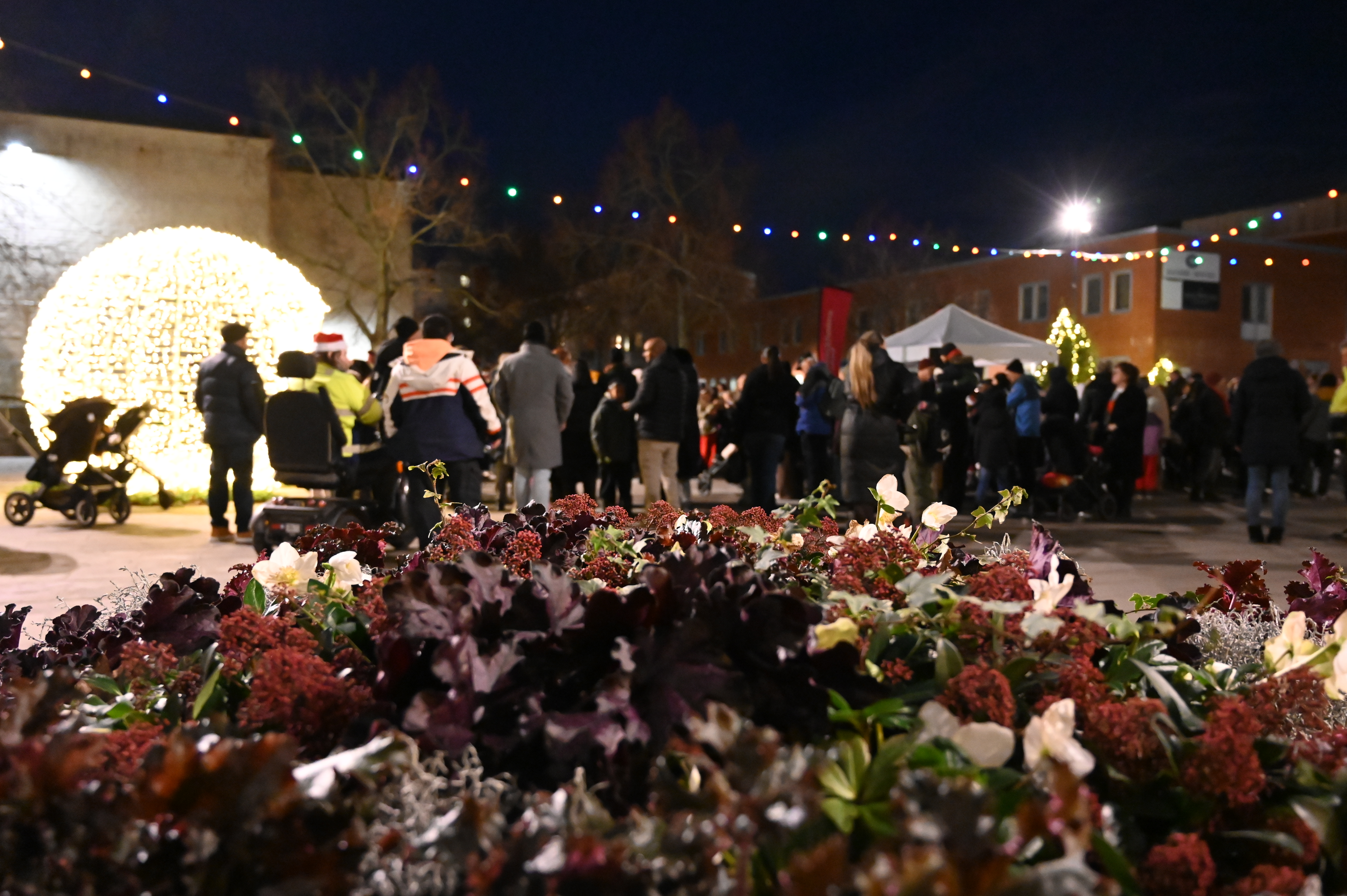Blommor i förgrunden, människor och julbelysning i bakgrunden på Sätra torg.