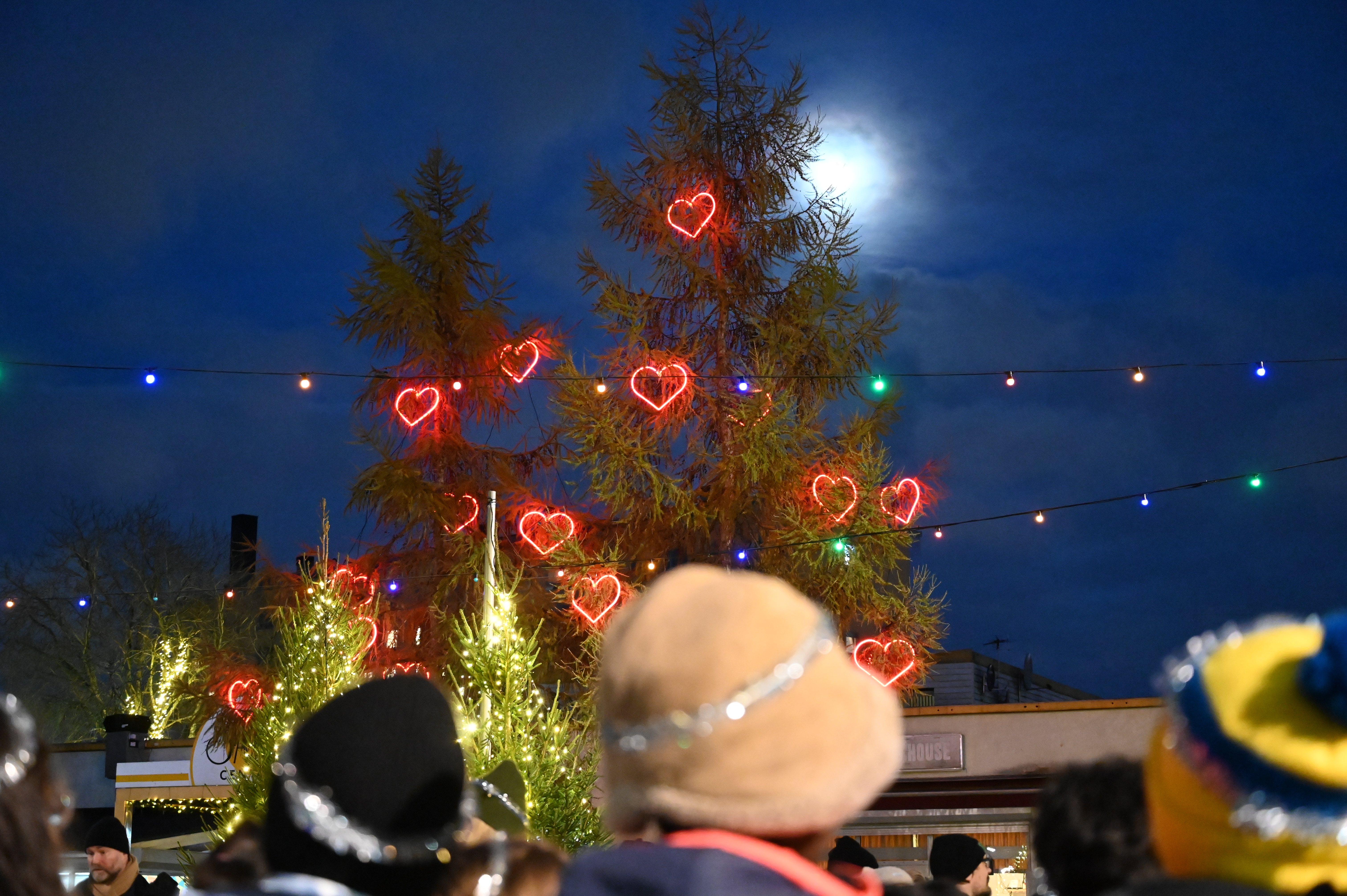 Lysande röda hjärtan i julgranar. Personer med mössor i förgrunden.