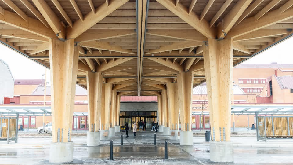 "Ett distinkt arkitekturhantverk skapar en helhetsmiljö och ett karaktärsfullt limträtak, som bildar en ny välkomnande entrésituation för alla trafikslag."
