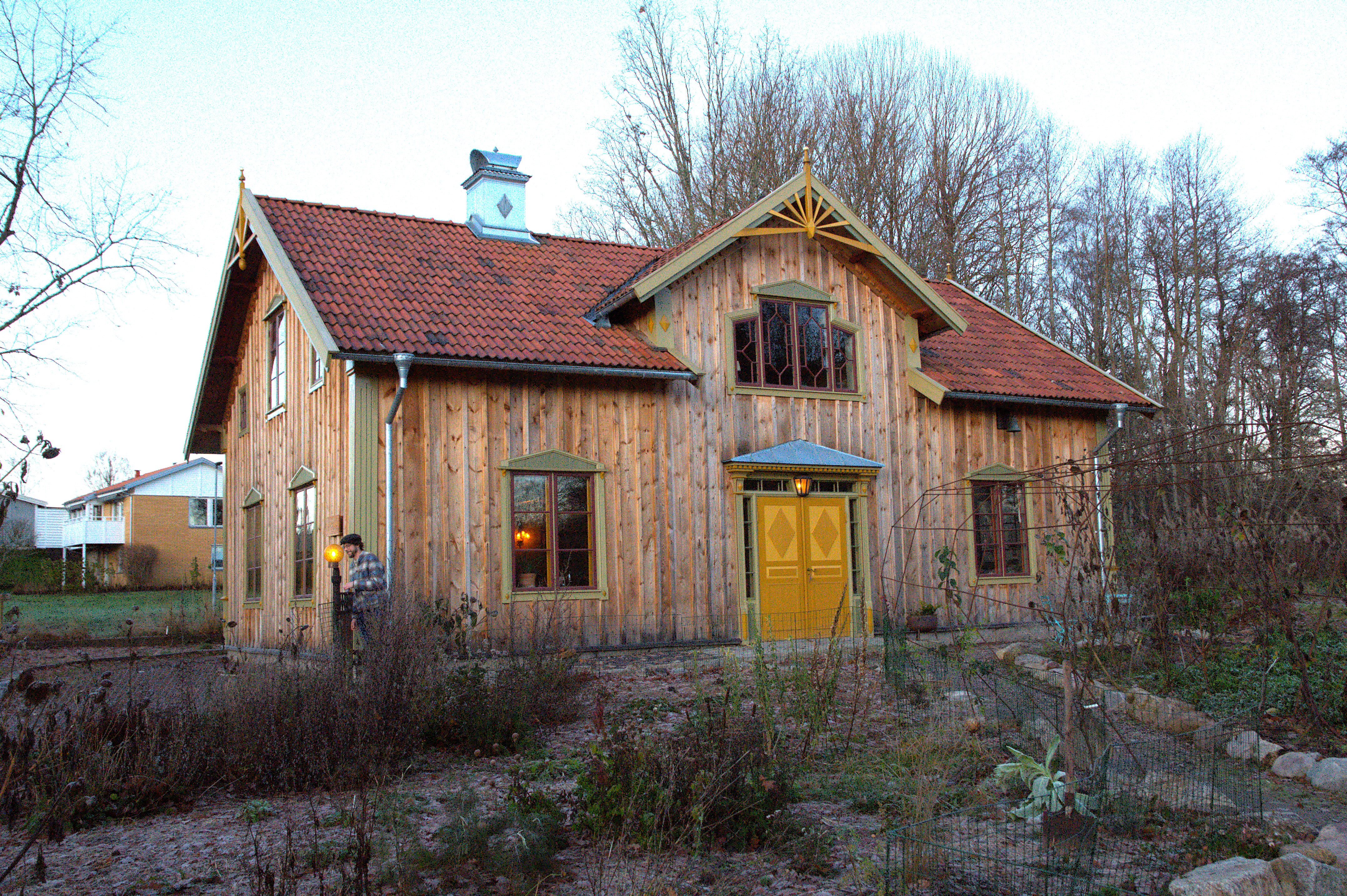 "En återuppförd timmerbyggnad med rikt utsmyckad ny fasad."
