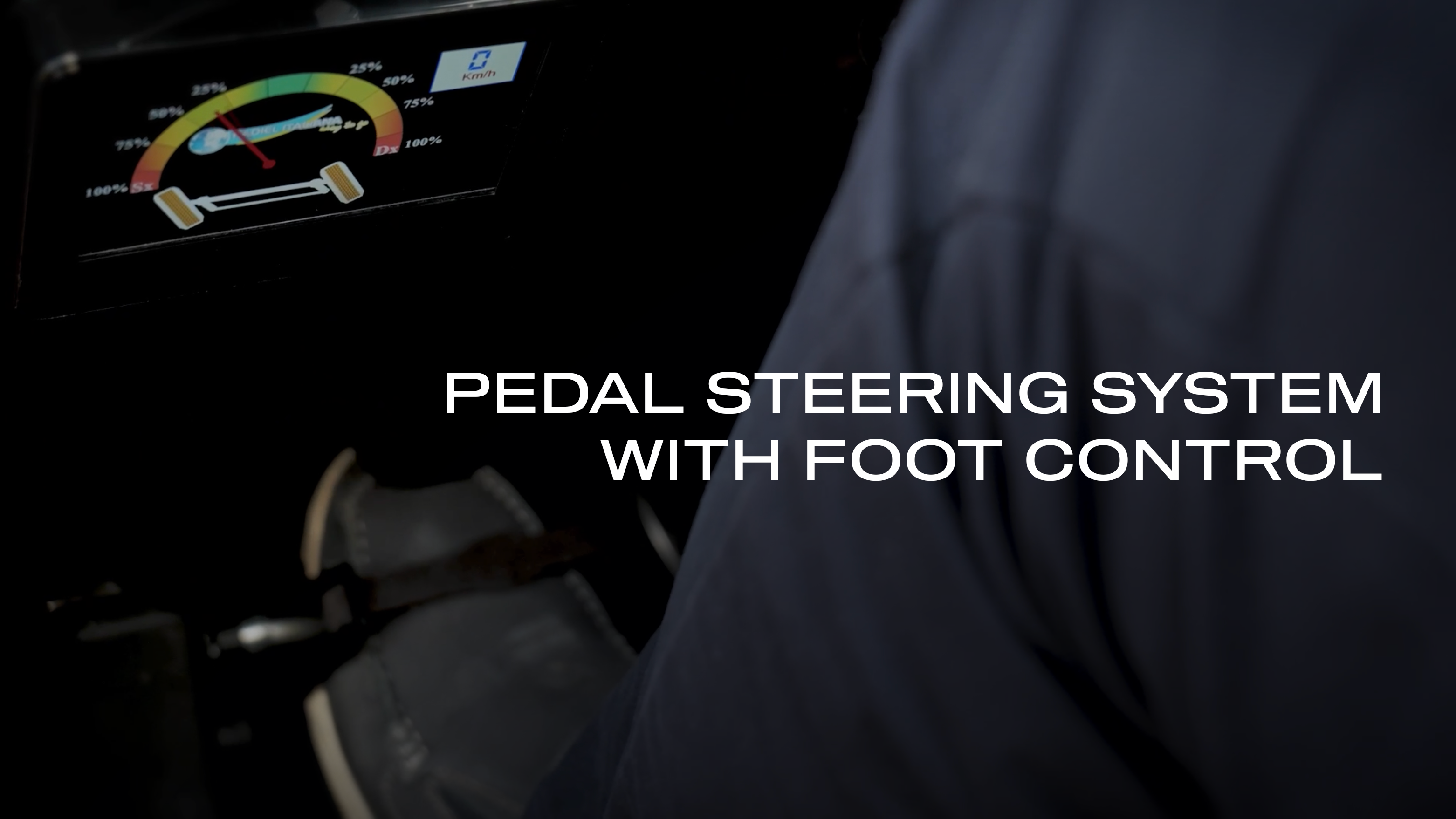 Ett elektromeckaniskt system med dubbla motorer gör det möjligt att styra bilen med hjälp av pedalrörelser i stället för traditionell rattstyrning. Arkitekturen är helt redundant – både motorer, batterier och styrdon är dubblerade – och systemet övervakas via en TFT-skärm som ger kontinuerlig återkoppling till föraren.
