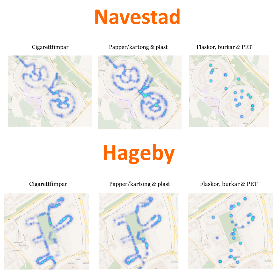 Under tre mättillfällen per vecka i nio veckor cyklade unga från Navestad och Hageby runt i sina egna stadsdelar med kameror och AI-enheter monterade på elcyklar. Totalt registrerades drygt 7 000 skräpföremål, allt från cigarettfimpar och förpackningar till flaskor och burkar. Resultaten visar tydliga skillnader mellan områdena, liksom vilka typer av skräp som dominerar på olika platser.
