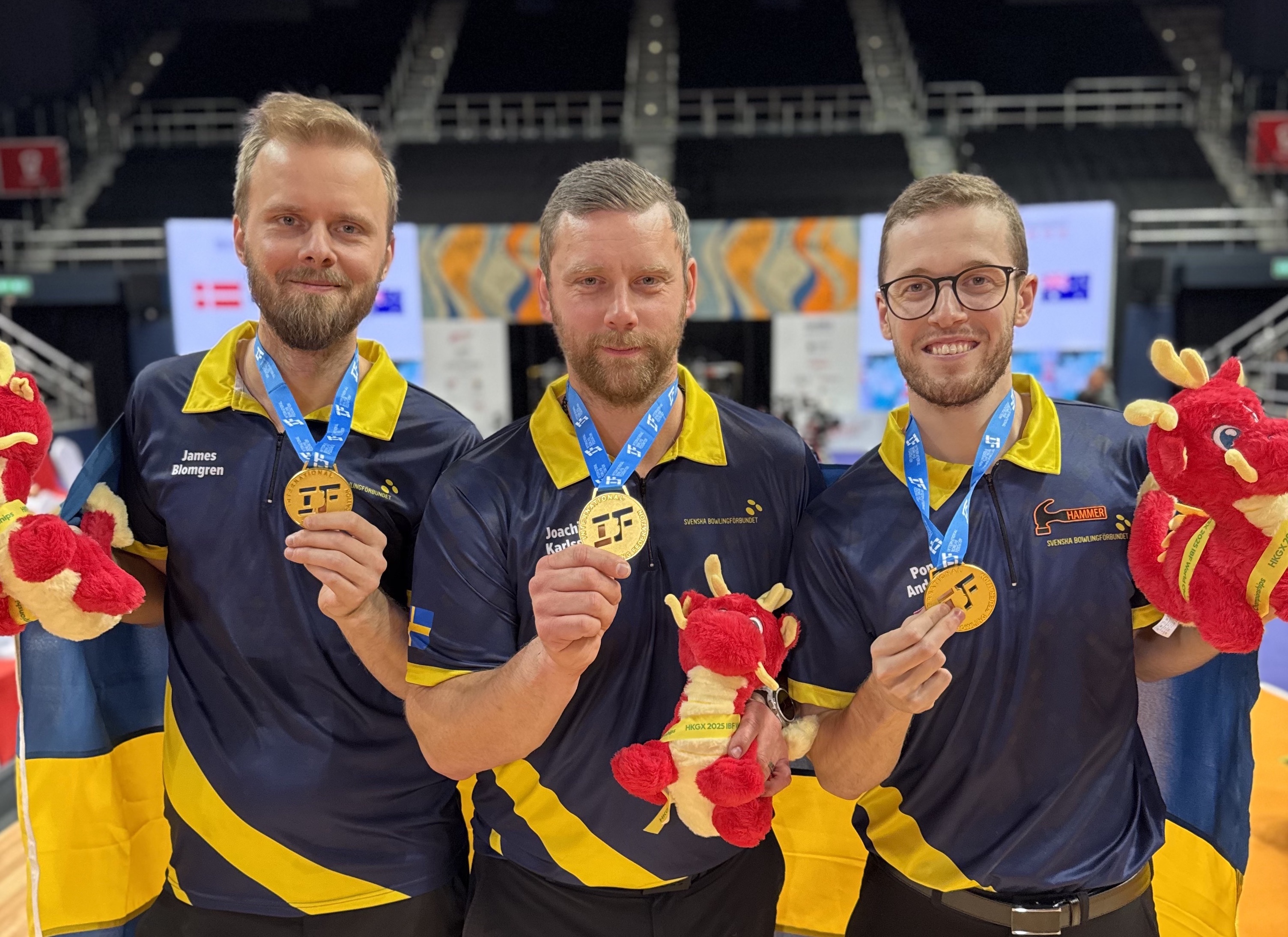 James Blomgren, Joachim Karlsson Rosén och Pontus Andersson vinner guld i 3-manna vid bowling-VM i Hongkong. Svensktrion vänder ett underläge i finalen och besegrar Danmark med 2-1.