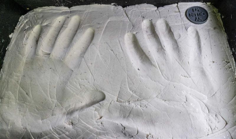 Bostadsministern kunde sedan trycka dit sina handavtryck. De förs senare över till en bronsplatta som vi hänger upp i ett av de tre husen.
