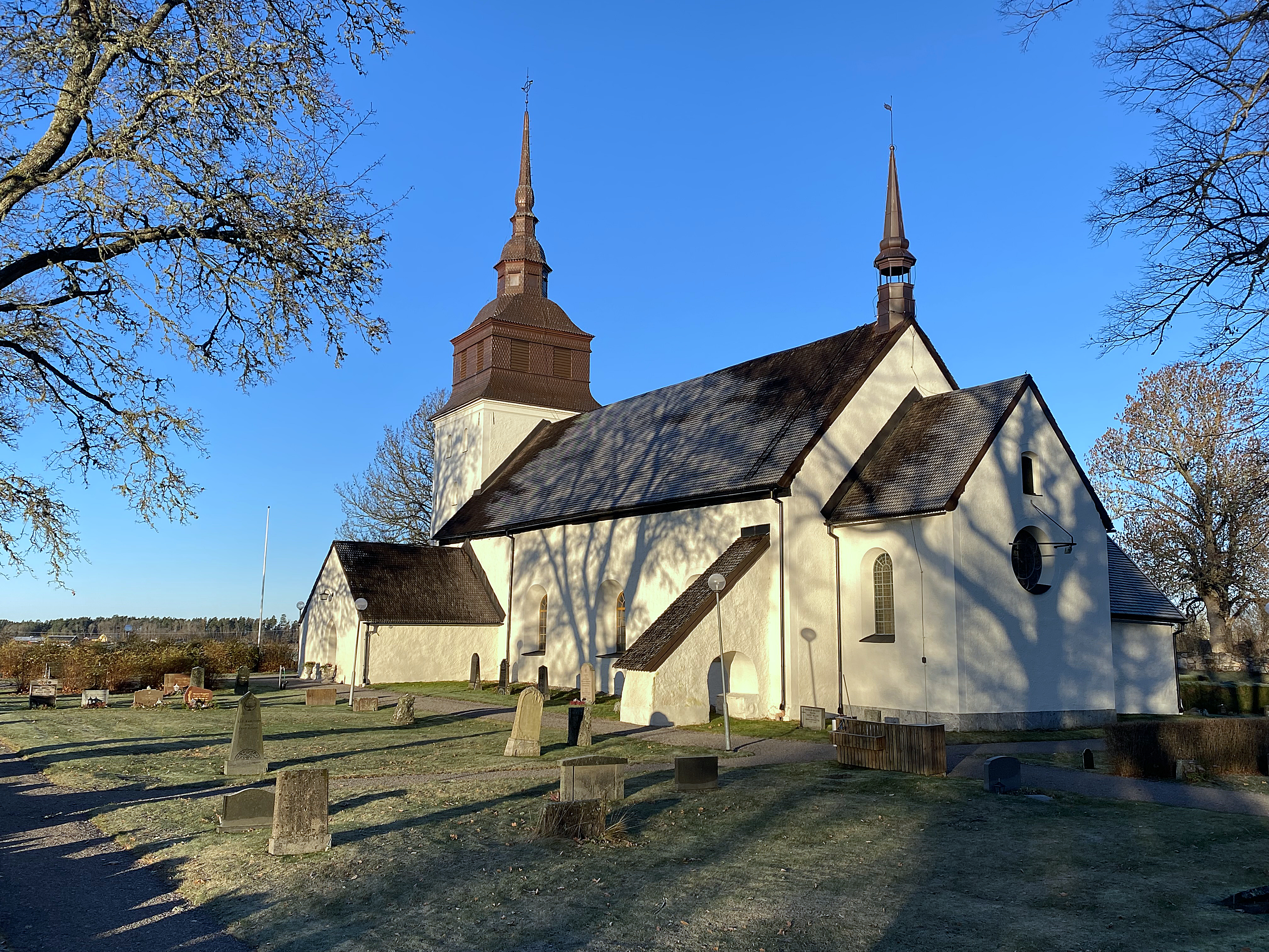 Vitkalkad kyrka i eftermiddagssol