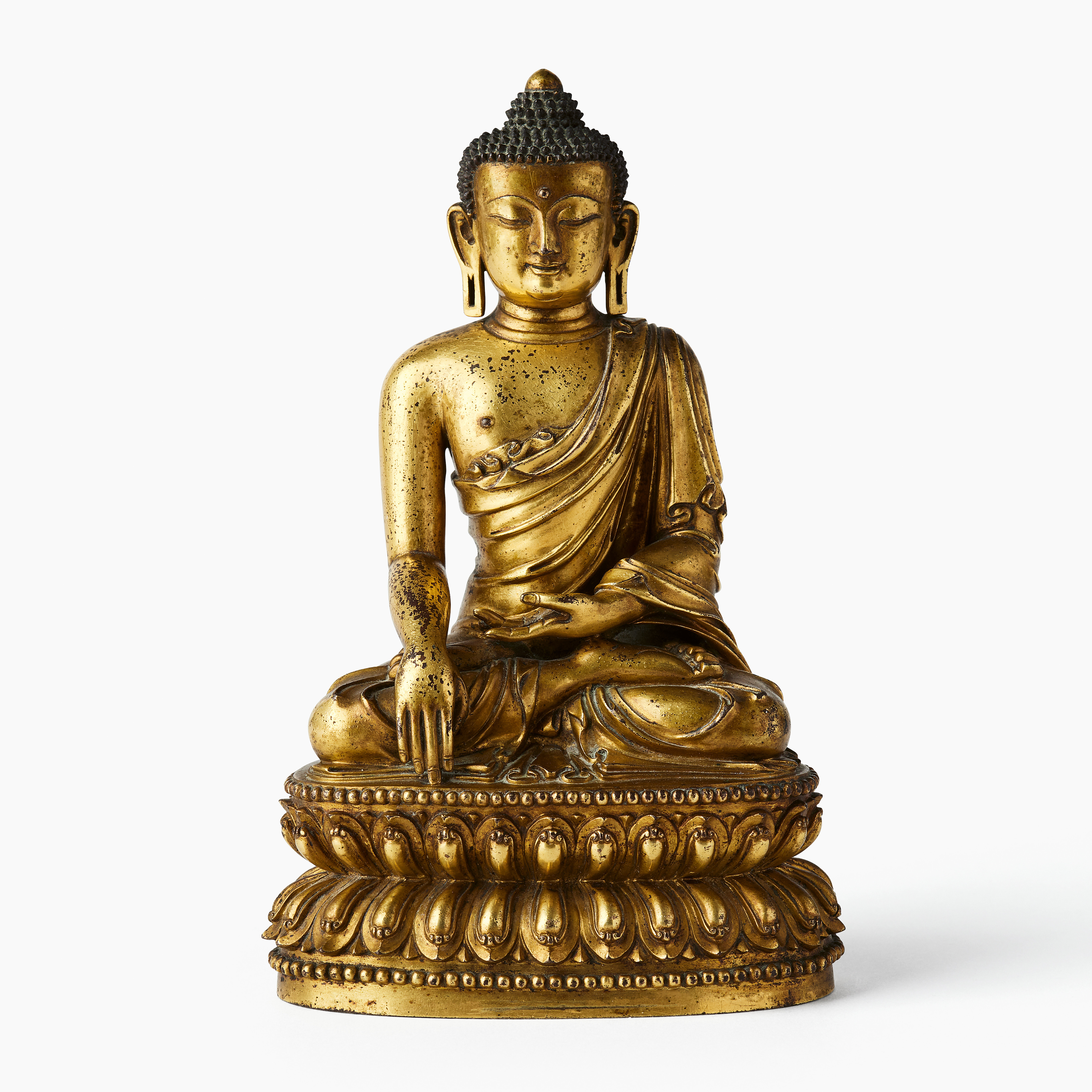 Skulpturen, drygt 18 centimeter hög och gjuten i förgylld brons, avbildar Shakyamuni Buddha i ett av de mest centrala motiven i buddhistisk ikonografi. Klädedräktens raffinerade drapering, de finmejslade detaljerna och den ovanligt rika förgyllningen placerar verket i en liten grupp av skickligt utförda skulpturer från den kejserliga Ming-verkstaden.