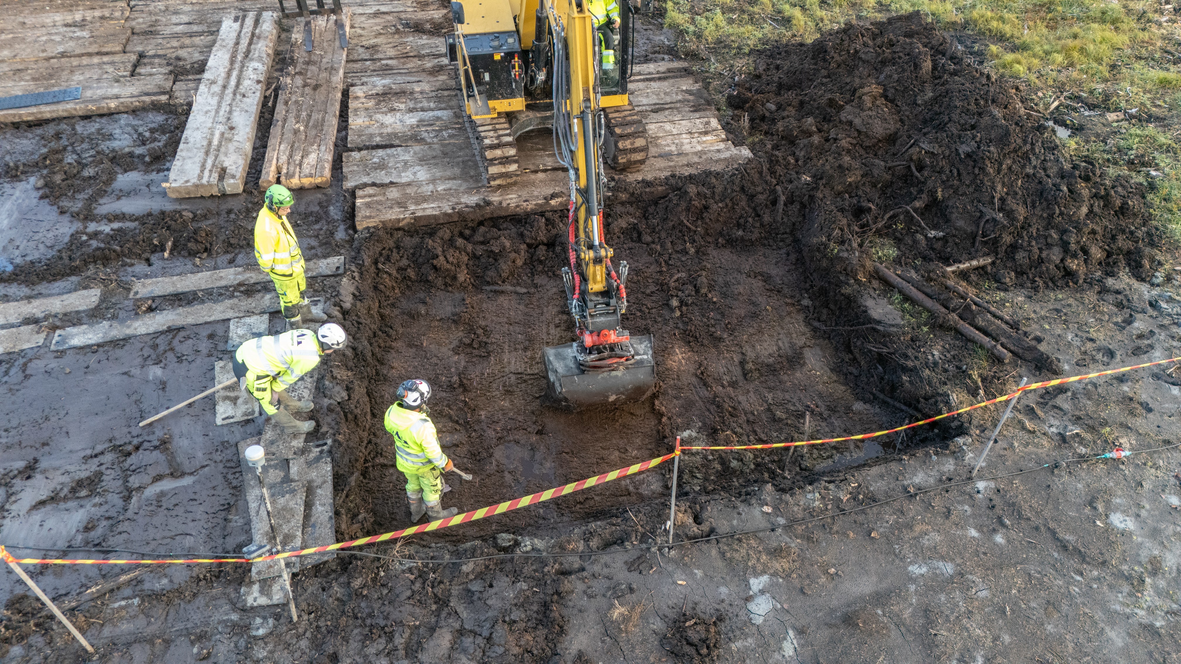 Undersökningen genomfördes parallellt med att ett påldäck för den kommande järnvägsbanken anlades. De vattenrika torvlagren gjorde arbetet logistiskt utmanande, men ett nära samarbete mellan arkeologer och entreprenörer möjliggjorde säker dokumentation.