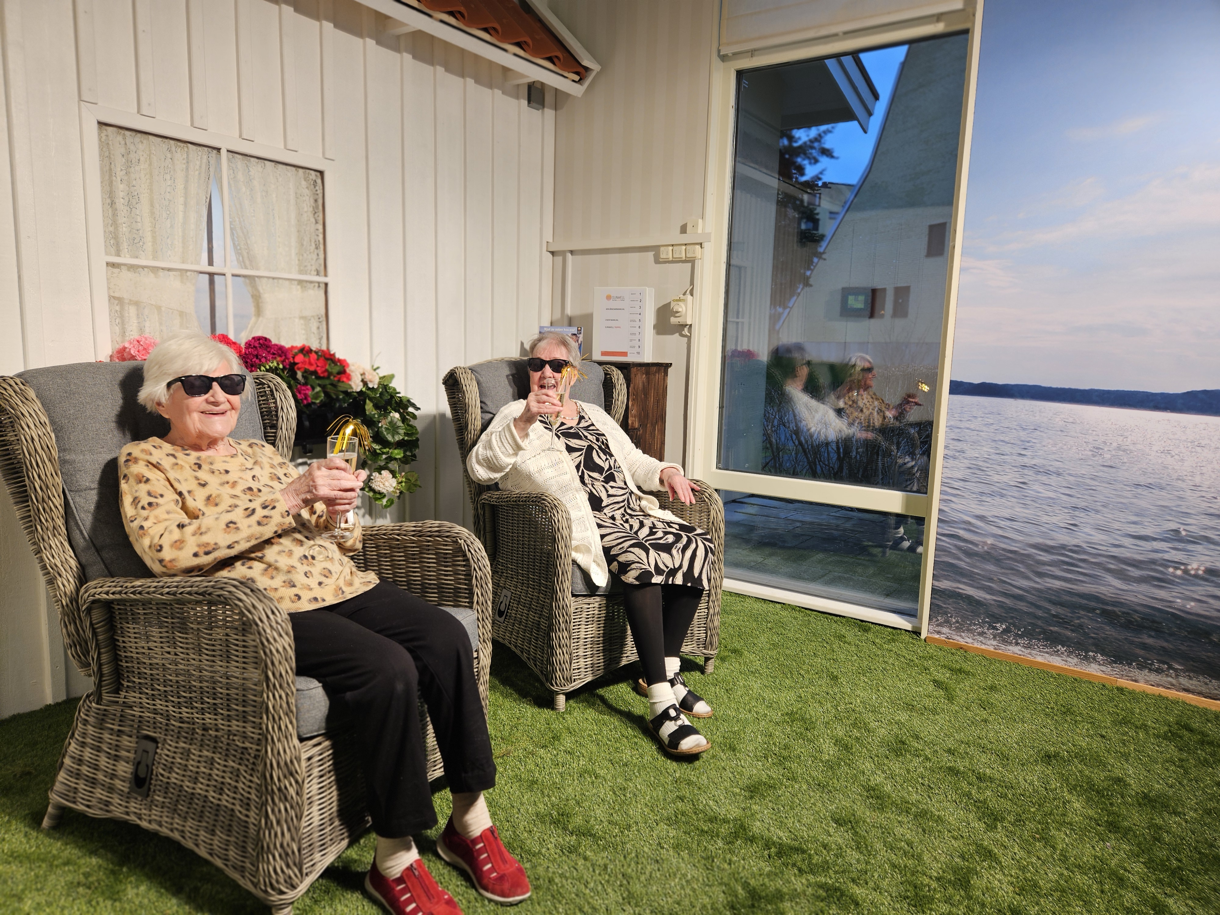 I taket sitter solsimulatorer och en fläkt som personalen kan reglera via en kontrollpanel på väggen. Lamporna förmedlar skön värme mot huden och utan att skada den. Det finns en förhoppning att rummen ska göra de äldre piggare och minska både fysiska och psykiska åkommor.