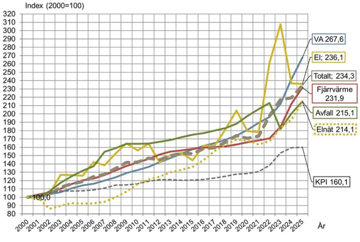 Både fjärrvärme samt vatten och avlopp har ökat med näst högsta nivån på 30 år. Fjärrvärmen har ökat med 9,2 procent och VA med 10,7 procent. Även avfallet har ökat med 7,3 procent, och elnätsavgifterna med 10,6 procent.