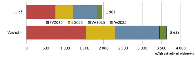 Figur 3: Jämförelse mellan Luleå och Vaxholms kommun: kostnaden för fjärrvärme, el, VA och avfall uttryckt i kr/månad och lägenhet inkl. moms.