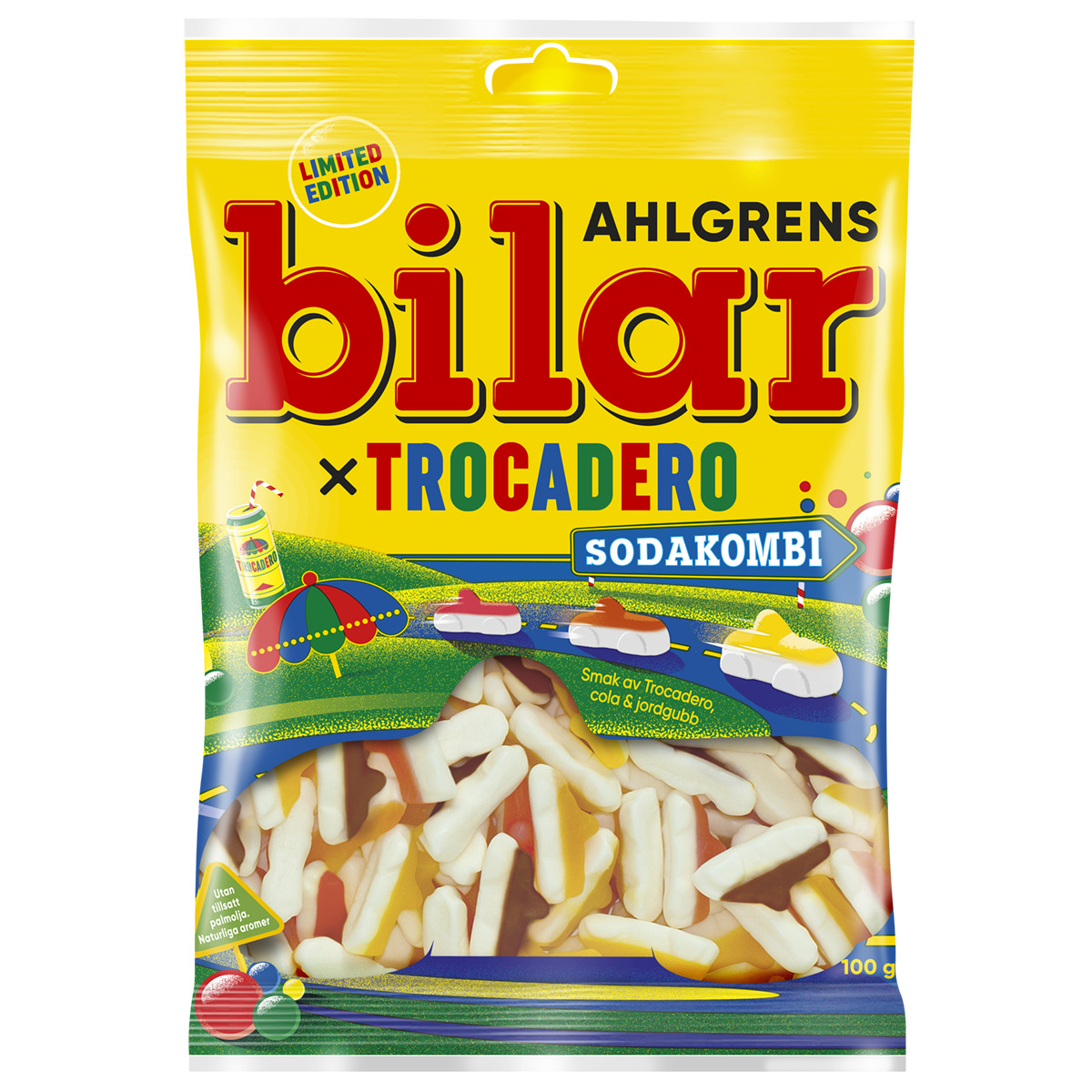 Ahlgrens bilar Sodakombi x Trocadero presenteras i limiterad upplaga i utvalda butiker i service och dagligvaruhandeln från och med vecka 19 2025. Produkten kommer i två olika storlekar; 100- respektive 130 gram.