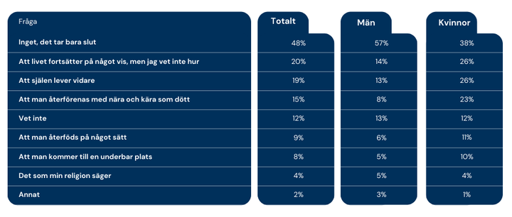 Av de som tror att någonting händer efter döden är det betydligt fler kvinnor än män som tror att det fortsätter på något sätt. Var fjärde kvinna tror att själen lever vidare (26 procent) eller att livet fortsätter på något vis, men vet inte hur (26 procent). Nästan lika många kvinnor tror att man återförenas med nära och kära som dött (23 procent). Bland männen är motsvarande andelar betydligt lägre – runt hälften av kvinnornas nivåer, och ofta ännu lägre.