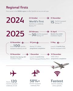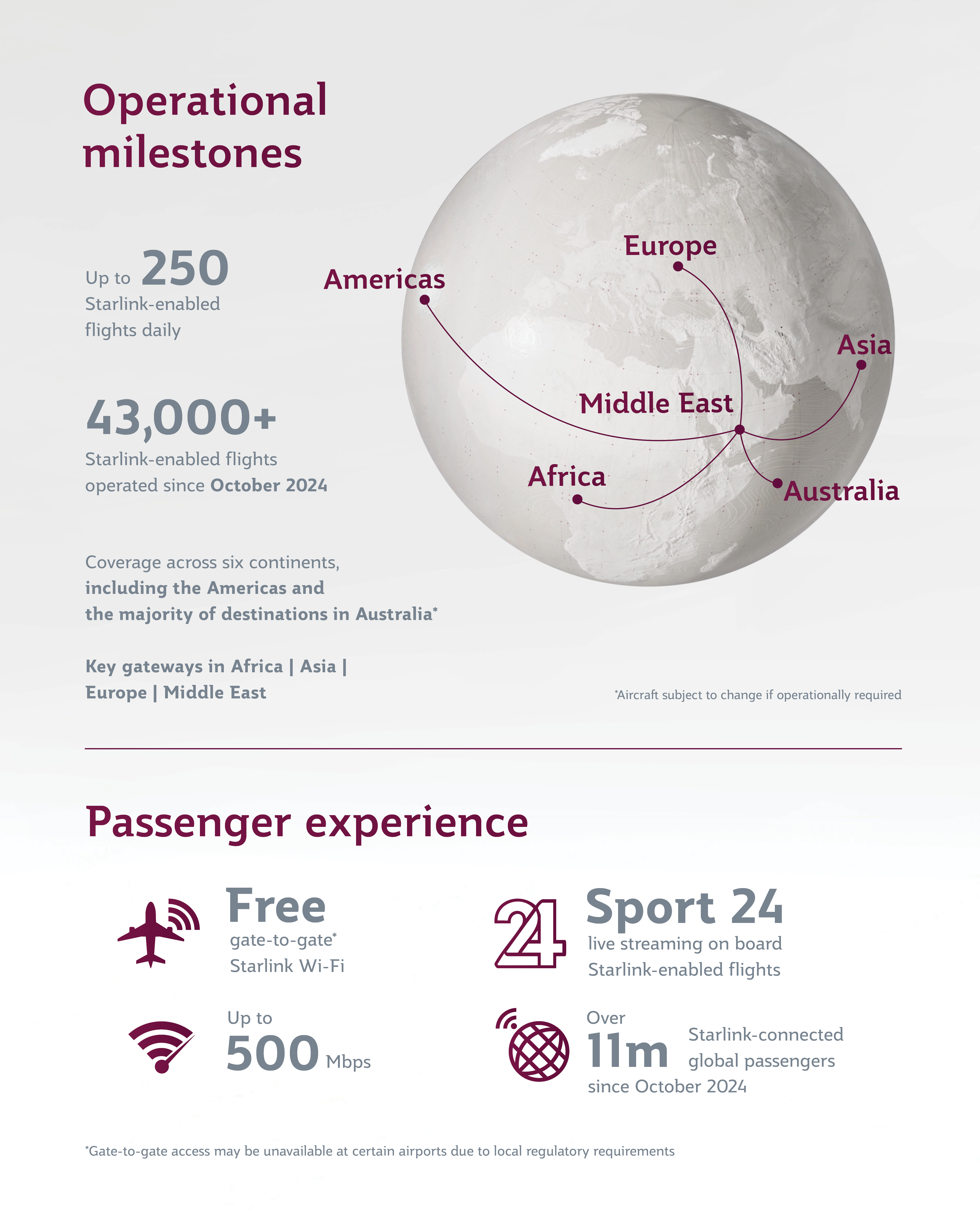 På bara 14 månader har flygbolaget både inlett och slutfört Starlink-införandet på Boeing 777 och Airbus A350, för att därefter även omfatta Boeing 787-flottan – den snabbaste och mest omfattande satsningen på Starlink för widebody-flygplan hittills. Detta stärker Qatar Airways position som global ledare inom Starlink-baserad uppkoppling för lång- och ultralångdistansflygningar och innebär samtidigt världens första och största Starlink-utrustade A350-flotta.
