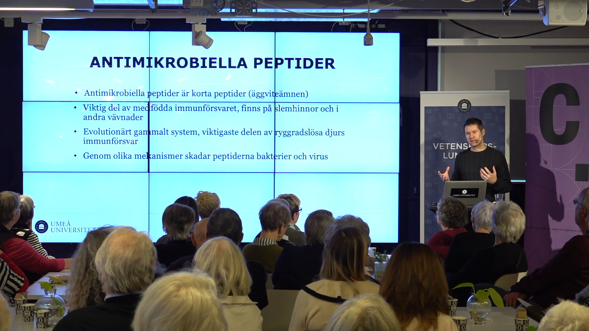 Föreläsningarna ger en inblick i många olika forskningsområden. Efteråt hålls en frågestund där publiken har möjlighet att ställa frågor. Det går också att följa föreläsningarna digitalt på umu.se/live.