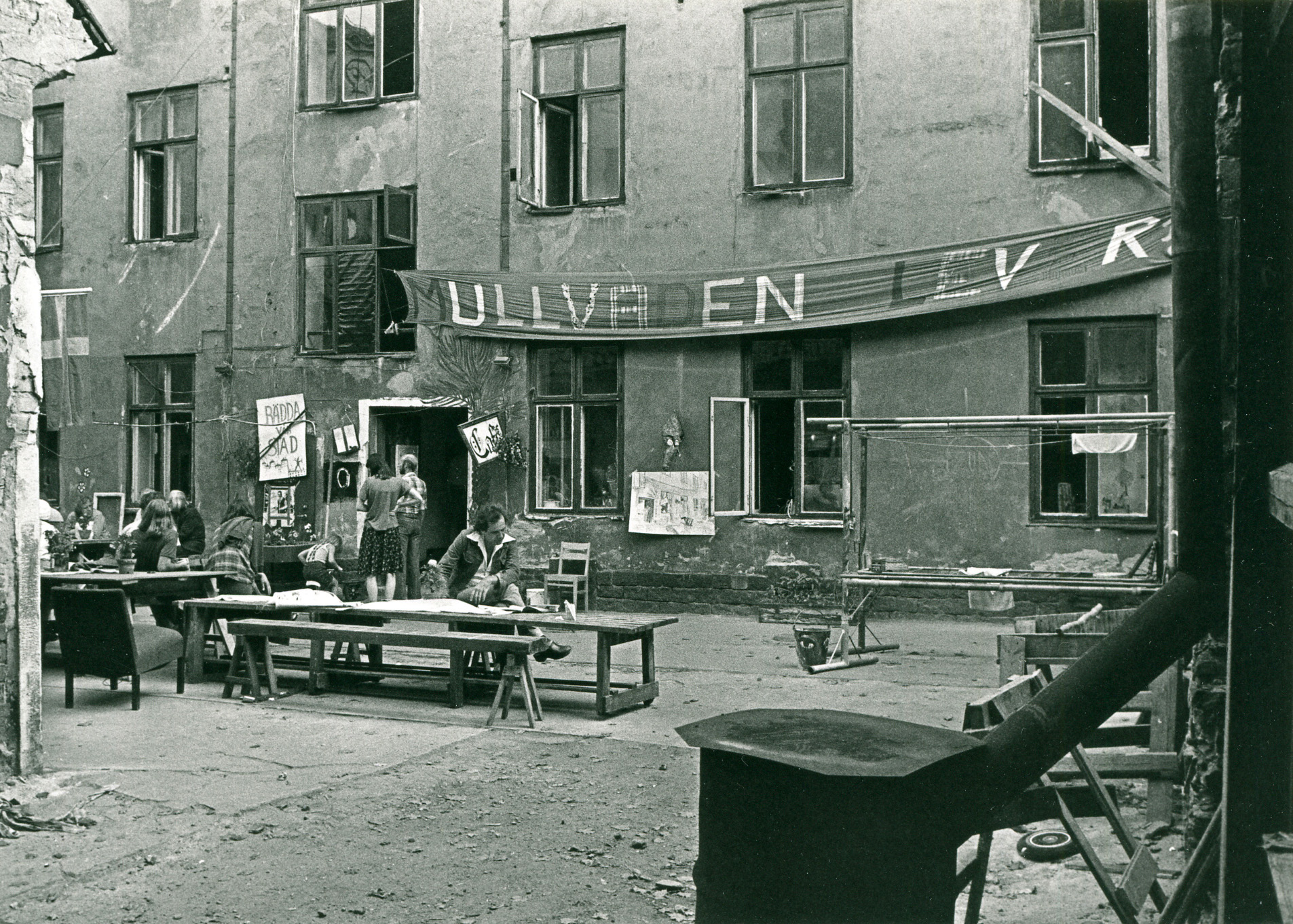 Protesternas Södermalm: ”Mullvaden lever” läser vi på banderollen på gårdshuset. Foto: Göran Fredriksson, sommaren 1978.
