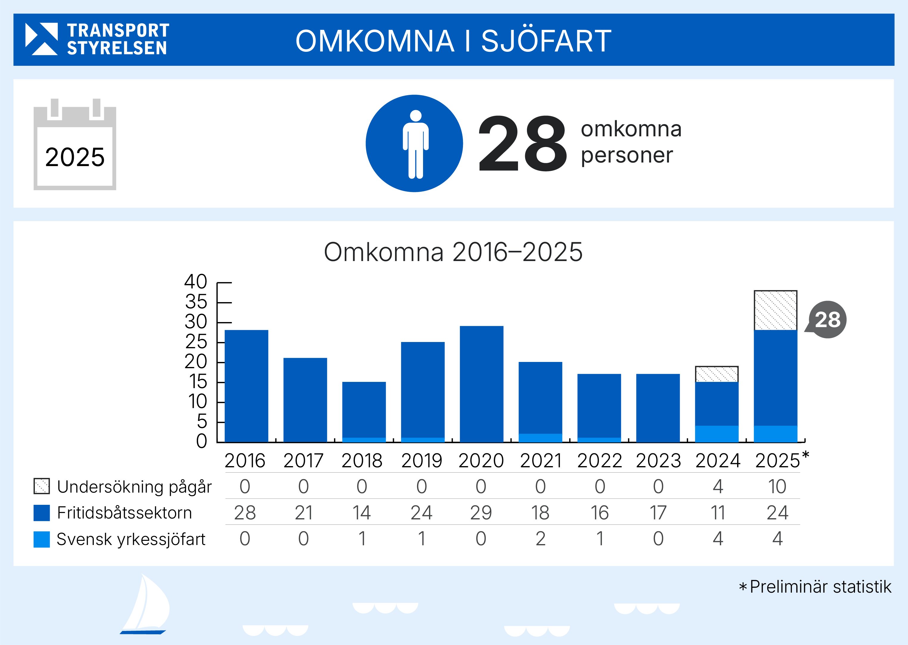Under året som gått omkom 28 personer till sjöss i Sverige – 24 inom fritidsbåtslivet och 4 inom den svenskflaggade yrkessjöfarten i olyckor som kopplas till fartygets drift. Det är en siffra som kan komma att ändras, eftersom ytterligare händelser med dödlig utgång undersöks inom båtlivet.