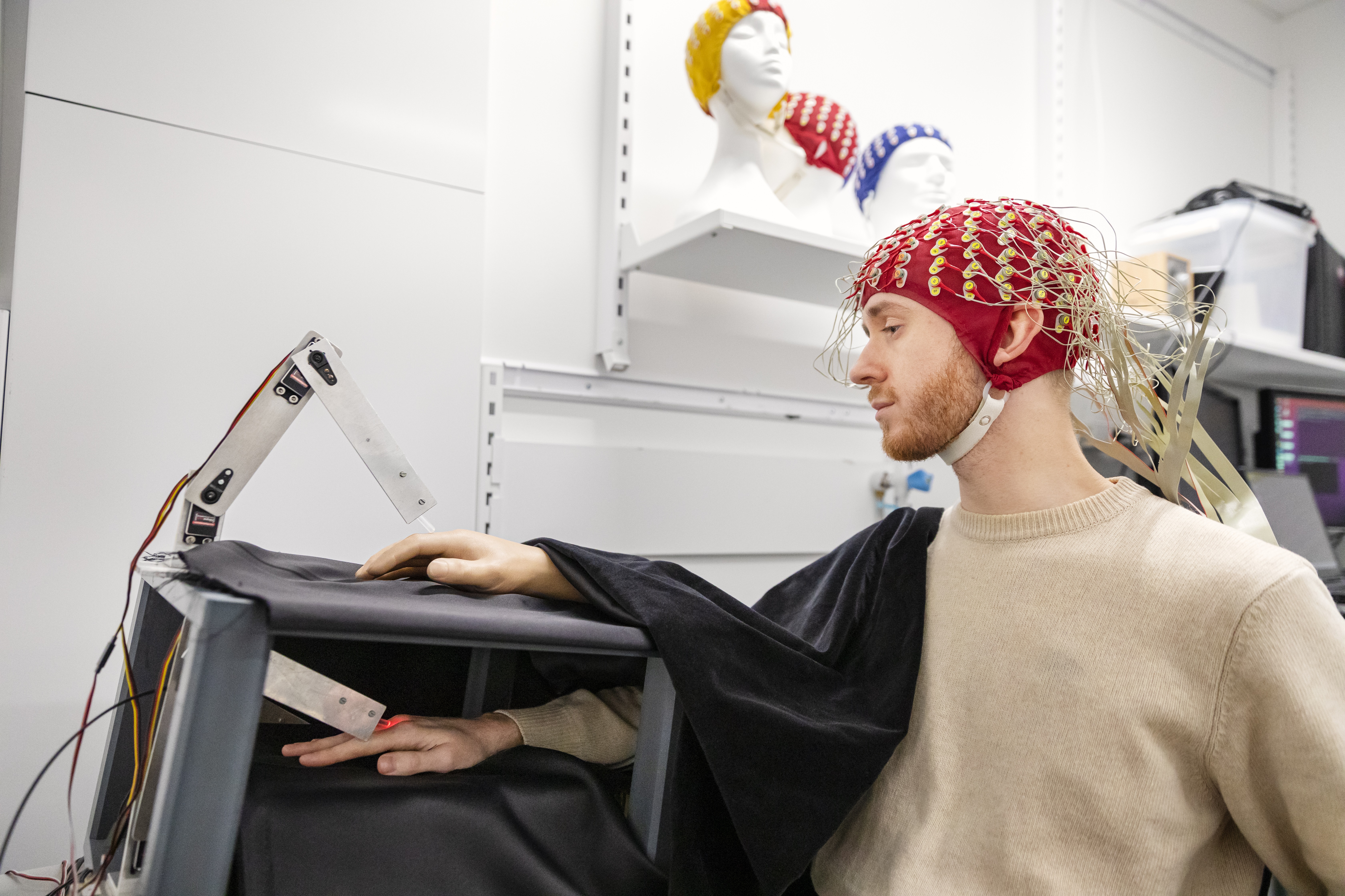 Genom att kombinera beteendeexperiment, hjärnregistreringar (EEG), hjärnstimulering och beräkningsmodellering hos totalt 106 deltagare har forskare vid Karolinska Institutet undersökt hur hjärnan integrerar syn- och känselsignaler för att skapa upplevelsen av att kroppen är ens egen. Deras experiment visar att frekvensen på alfavågor i hjässloben, den del av hjärnan som integrerar sinnesintryck från kroppen, avgör hur precist vi uppfattar vår kropp som vår egen.