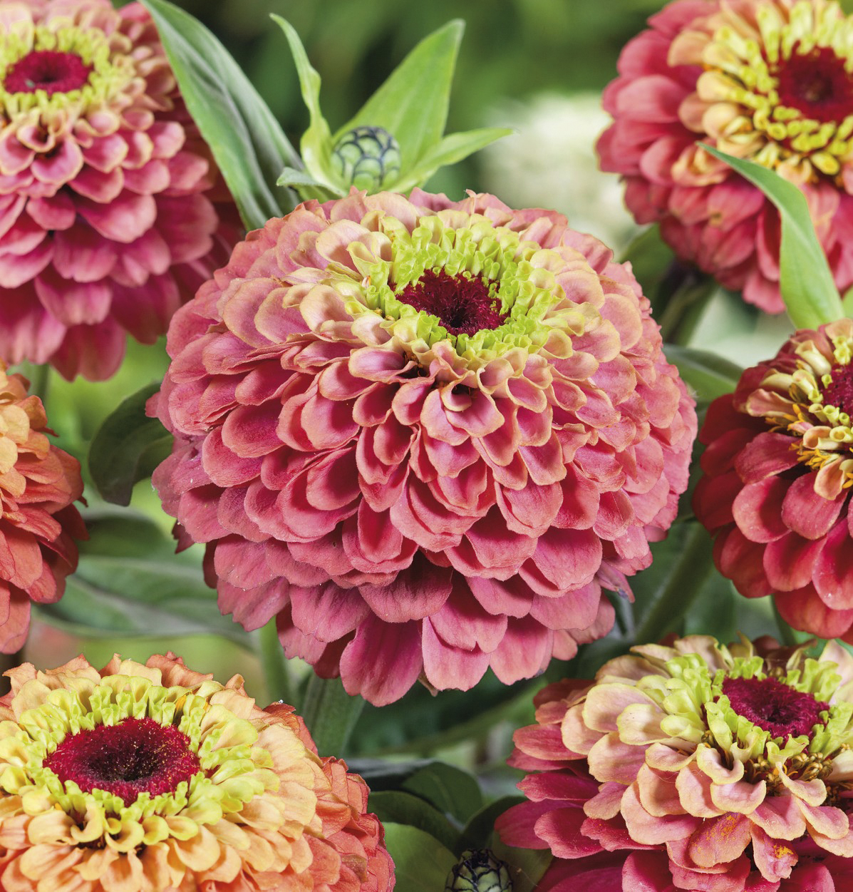 Mångskiftande, utsökt zinnia i toner av lime och gammalrosa. Också blomformen varierar effektfullt med dubbla, halvdubbla och enkla blommor. Fin snittblomma. Stadiga stjälkar och långvarig blomning bidrar till det höga odlingsvärdet. Uppskattas av våra pollinatörer.
