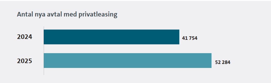 Antalet nya privatleasade bilar i Sverige steg med 25 procent under 2025 jämfört med 2024. Tillväxten för privatleasing var kraftig med tanke på att hela bilmarknaden i Sverige utvecklades svagt 2025 med en tillväxt på enbart 1,3 procent.