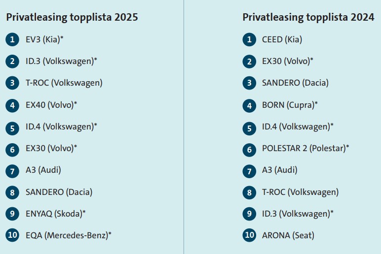 Leasing som finansieringsform stärker sin position på den svenska bilmarknaden. Under perioden januari till juni 2025 valde 46 procent av hushållen att finansiera sin nya bil genom leasing, vilket är en liten ökning. Det innebär att andelen privatleasade bilar närmar sig de nivåer som var innan perioden med räntehöjningar. Privatleasing fortsätter också att spela en stor roll för omställningen till eldrift. Aldrig tidigare har elbilar dominerat så mycket på 10 i topplistan över privatleasade bilar - 6 av 10 bilar på listan är renodlade elbilar.