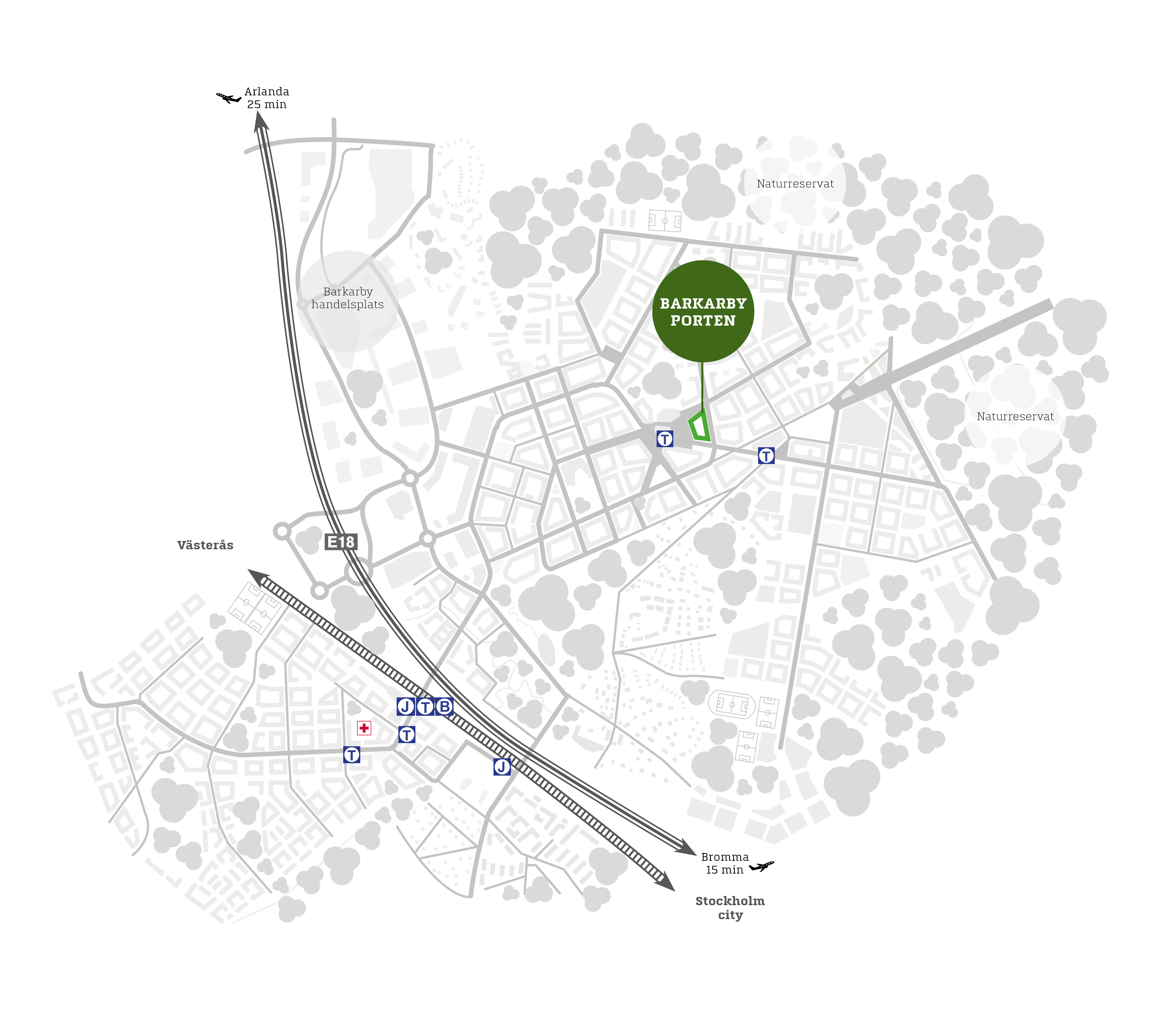 Kvarteret, som heter Barkarbyporten, har ett mycket centralt och strategiskt läge vid Sveatorget där Barkarbystadens tunnelbanestation beräknas öppna i slutet av 2027. Det är här stadslivet blir som mest livfullt med restauranger, kaféer, handel och annan service. Samtidigt finns det flera fina naturreservat på gångavstånd.