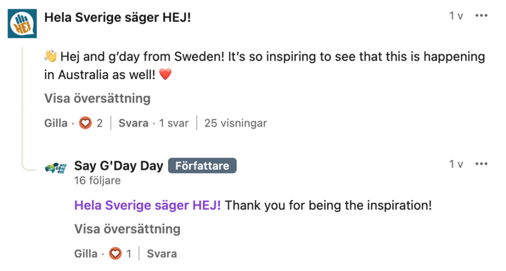 Det var under ett globalt nätverksmöte som Christian presenterade det svenska initiativet. Därefter hörde en nätverkskollega från Australien av sig: ”Det där borde vi göra här!”. Resultatet blev Say G’day Day, som genomförs samma dag den 21 november.
