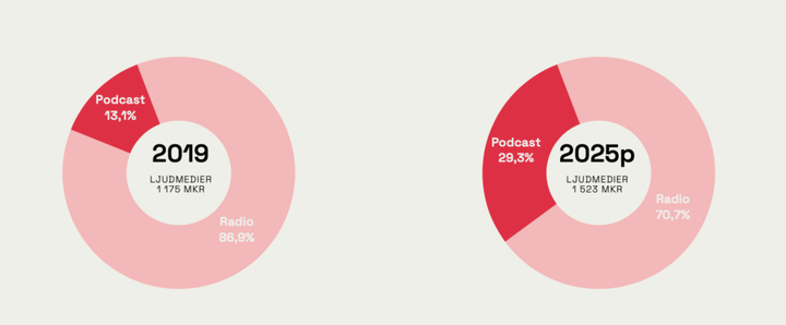 Sedan den första rapporten 2019 har podcast tagit en allt större andel av investeringarna inom ljudmedier. År 2019 utgjorde investeringarna i podcast 13 % medan de 2025 beräknas ligga på 30 %.